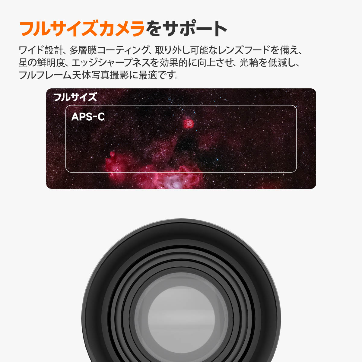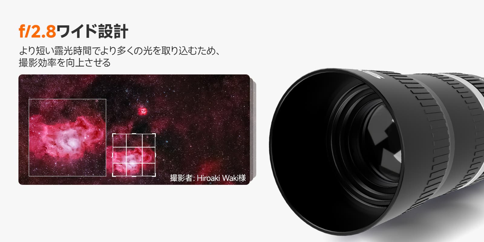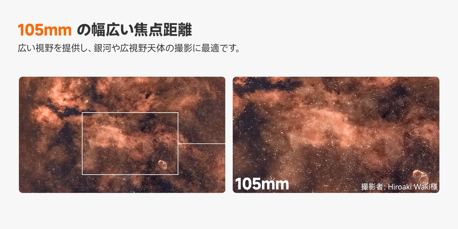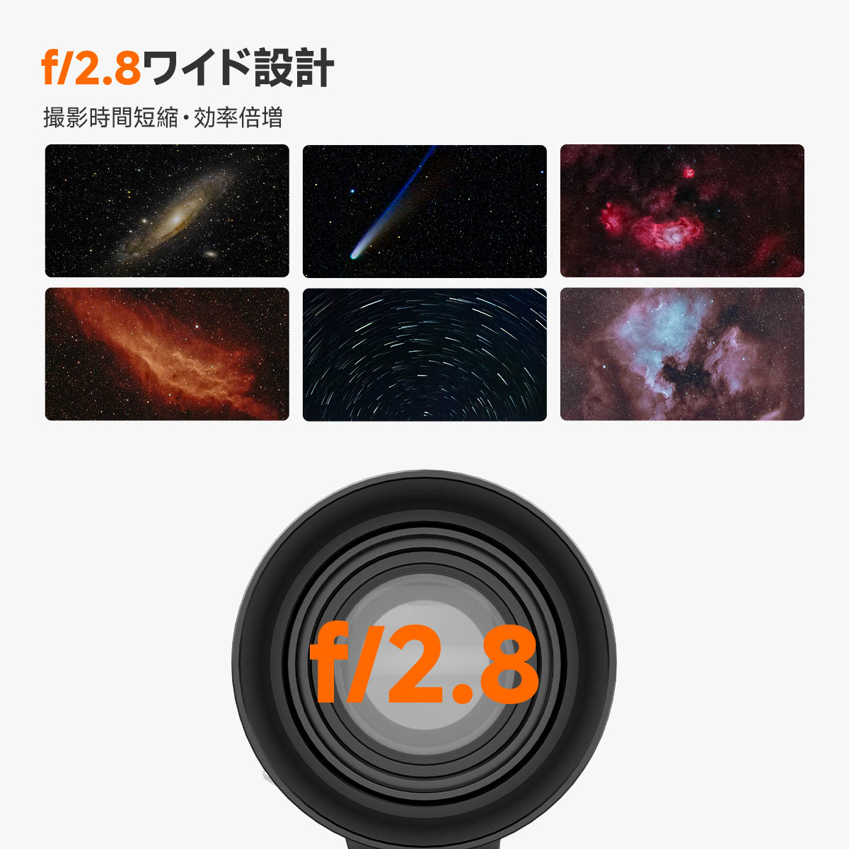 【明るいF2.8と広視野】明るいF2.8により、暗所でも手ブレしにくく、星雲や星団の細部を明るく鮮明に捉えます。105mm焦点距離と組み合わせることで、広い視野で星空のパノラマを撮影できます。