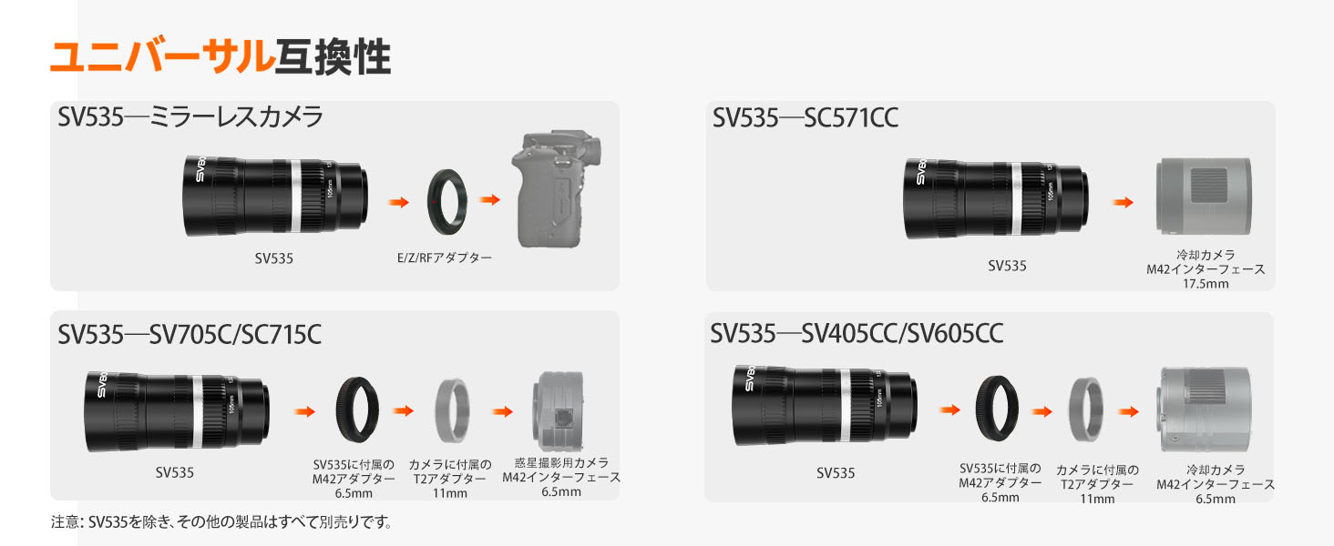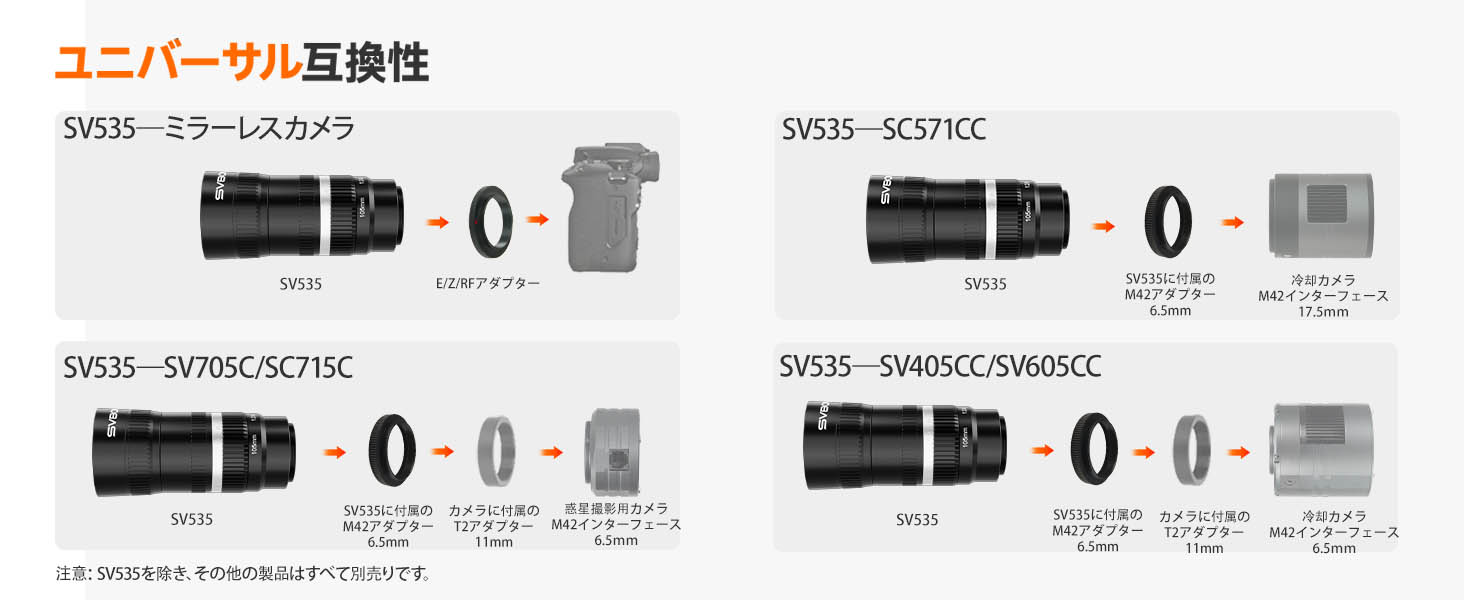 注意:SV535本体(標準パケージ)には、ソニーEマウントアダプターが付属しています。キヤノンまたはニコン用のアダプターが必要な場合は、対応するリンクを選択してご購入ください。