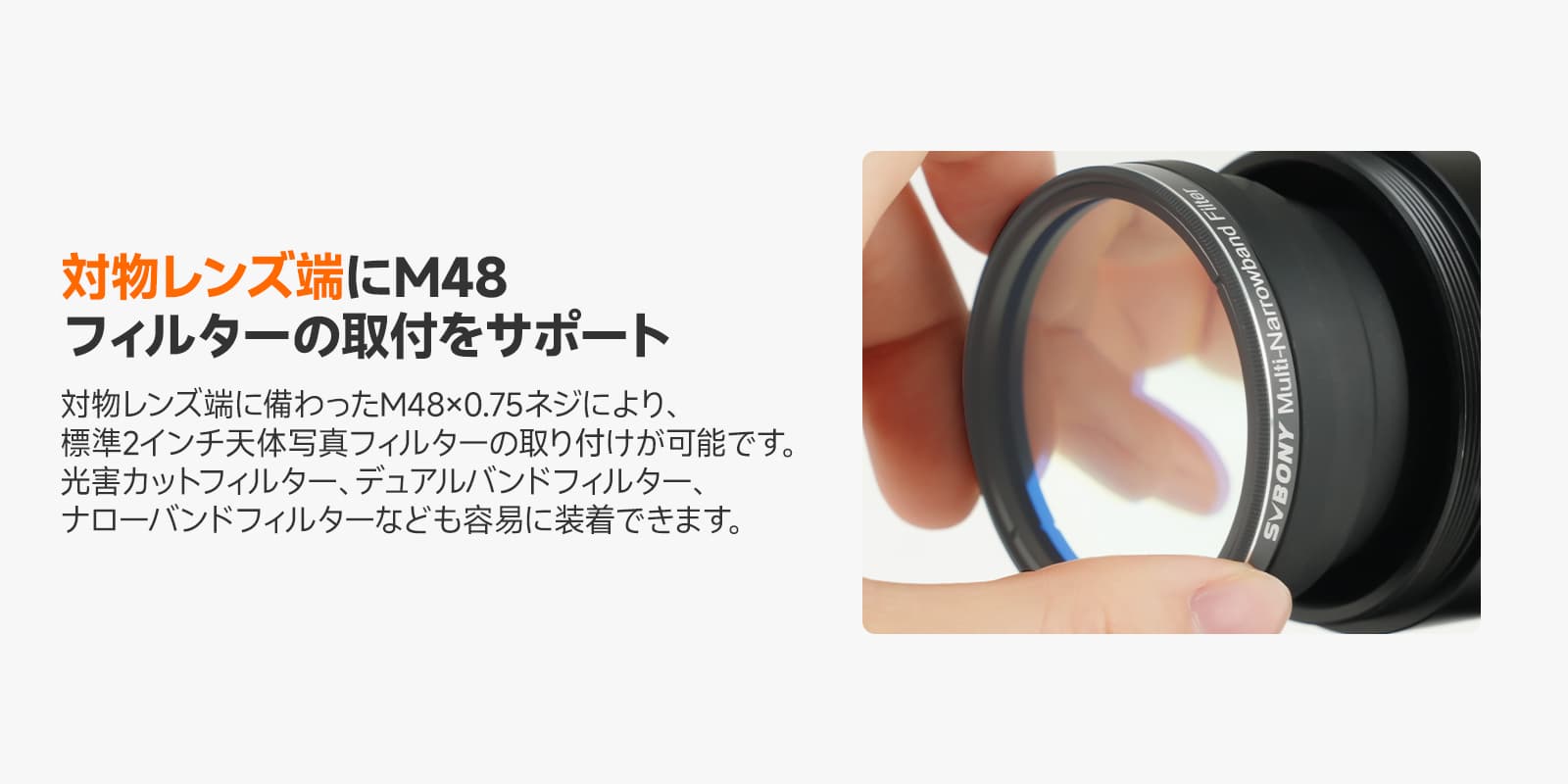 【2インチフィルター対応】対物レンズ端に標準2インチ(M48)ネジを装備しています。保有する2インチフィルターをそのまま使用でき、天体・日常撮影間で機材を共有し、撮影の幅と柔軟性を高めます。