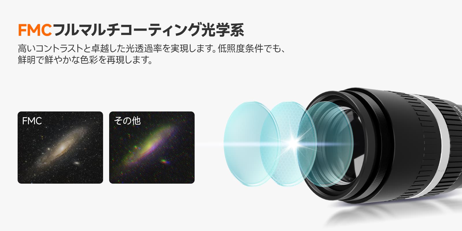 FMCコーティングは、光の反射を最小限に抑えて透過率を高めることで、画像の明るさ、コントラスト、解像度を向上させ、ゴーストやフレアを抑制します。これにより、暗い天体や対象の微細なディテールまで、より鮮明でシャープに捉えることが可能になります。