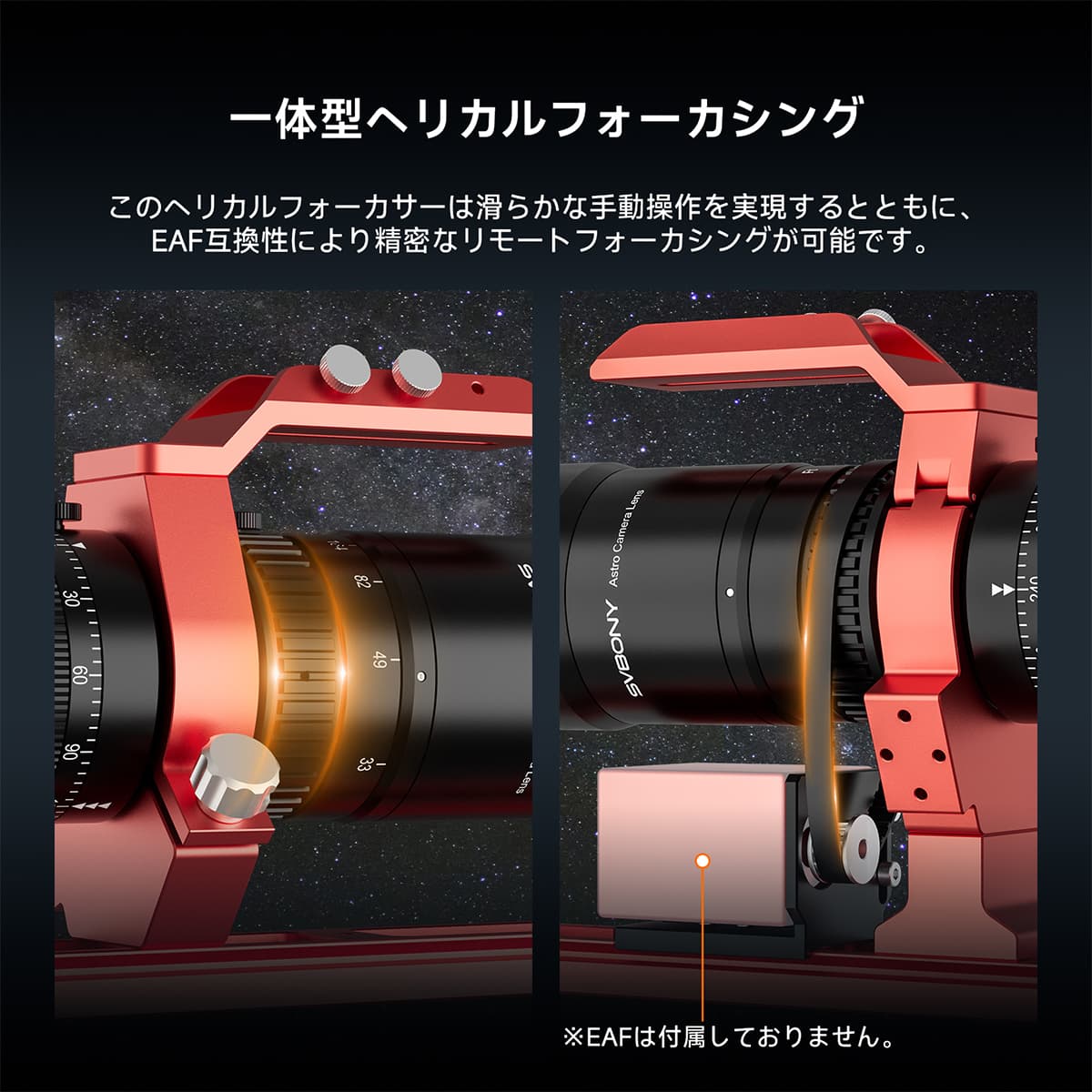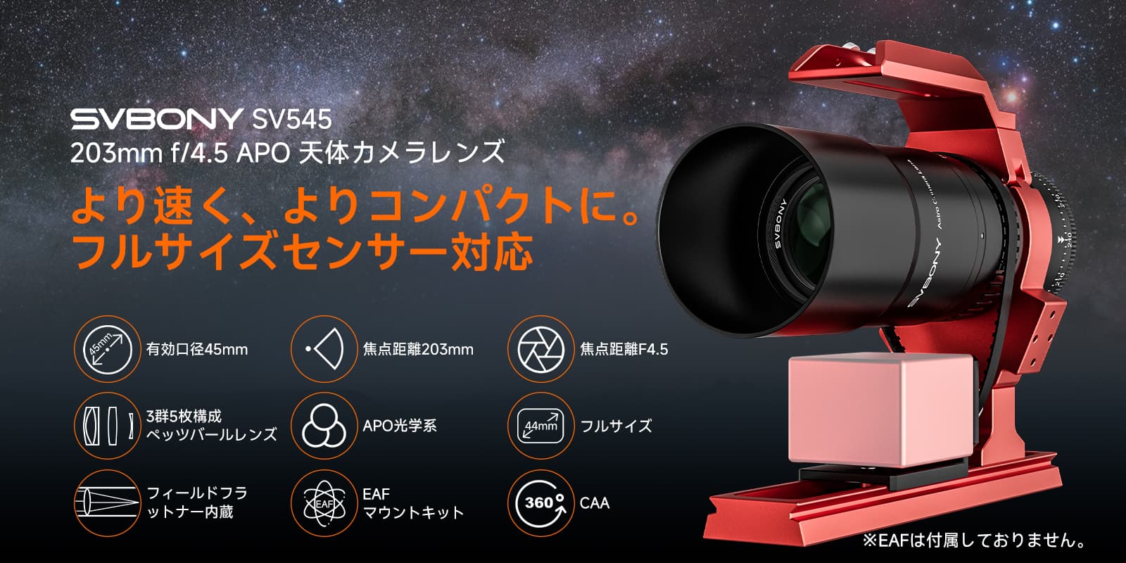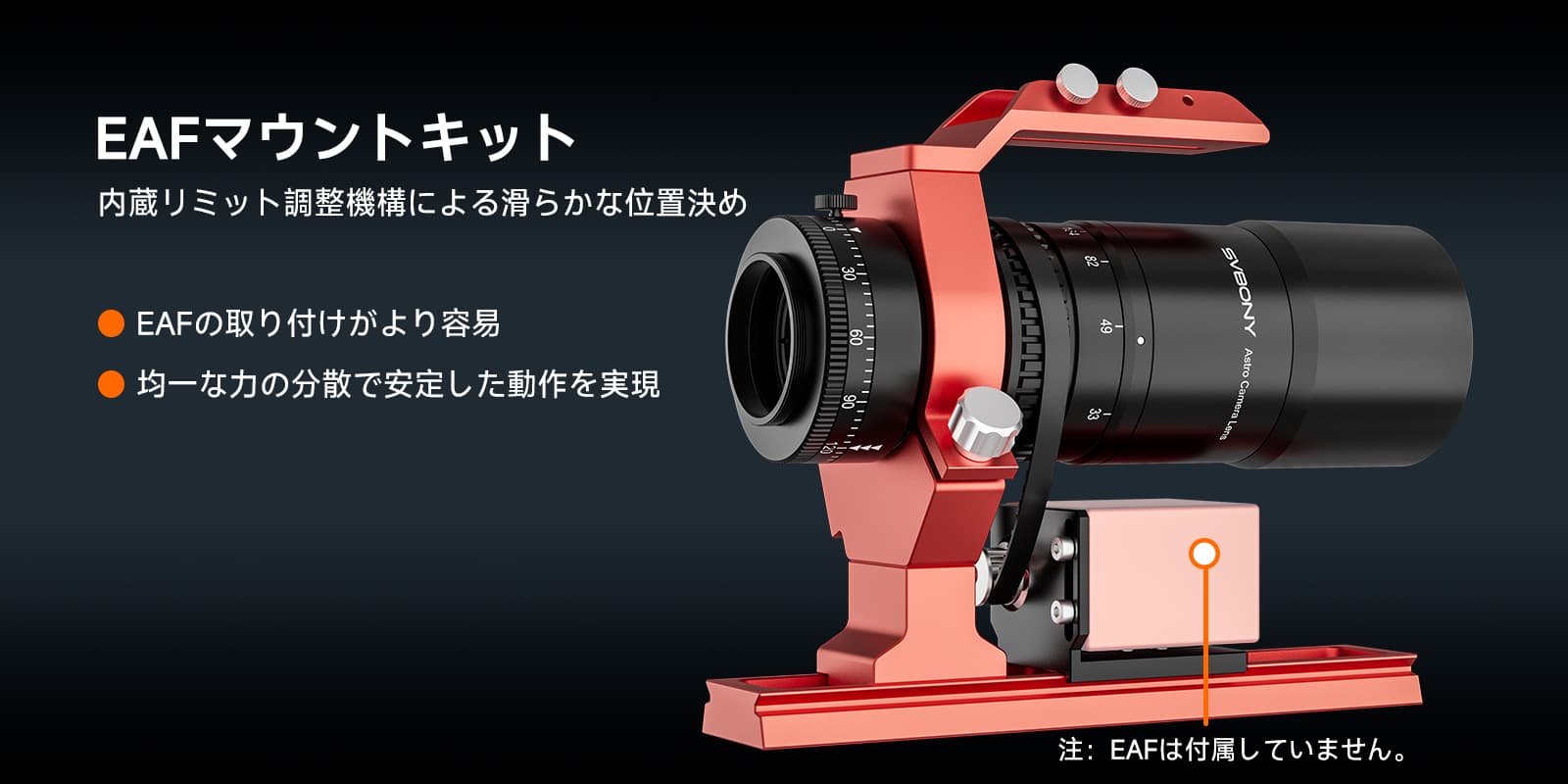 【操作が簡単】SV545にはEAFマウントキット(EAFは含まれていません)が装備されており、自動で正確な焦点合わせを実現できます。正確な撮影角度を素早く簡単に取得できます。(注:現在のバージョンは第 1 世代の EAF のみをサポートしており、第 2 世代の EAF とは互換性がありません。)