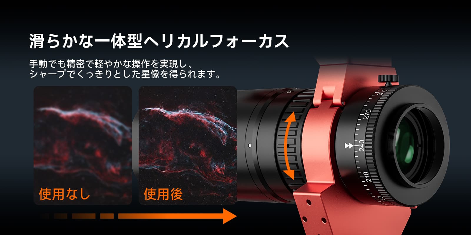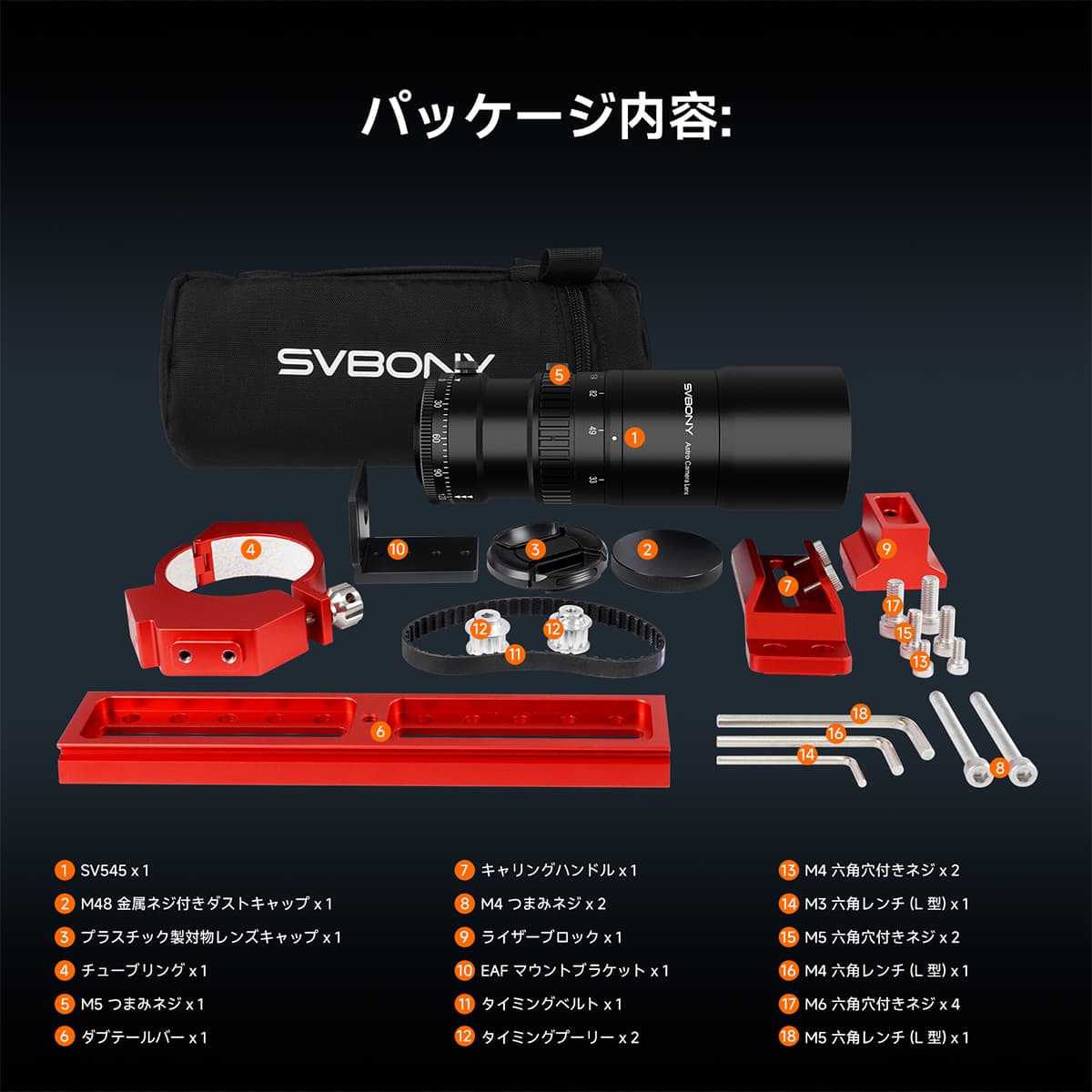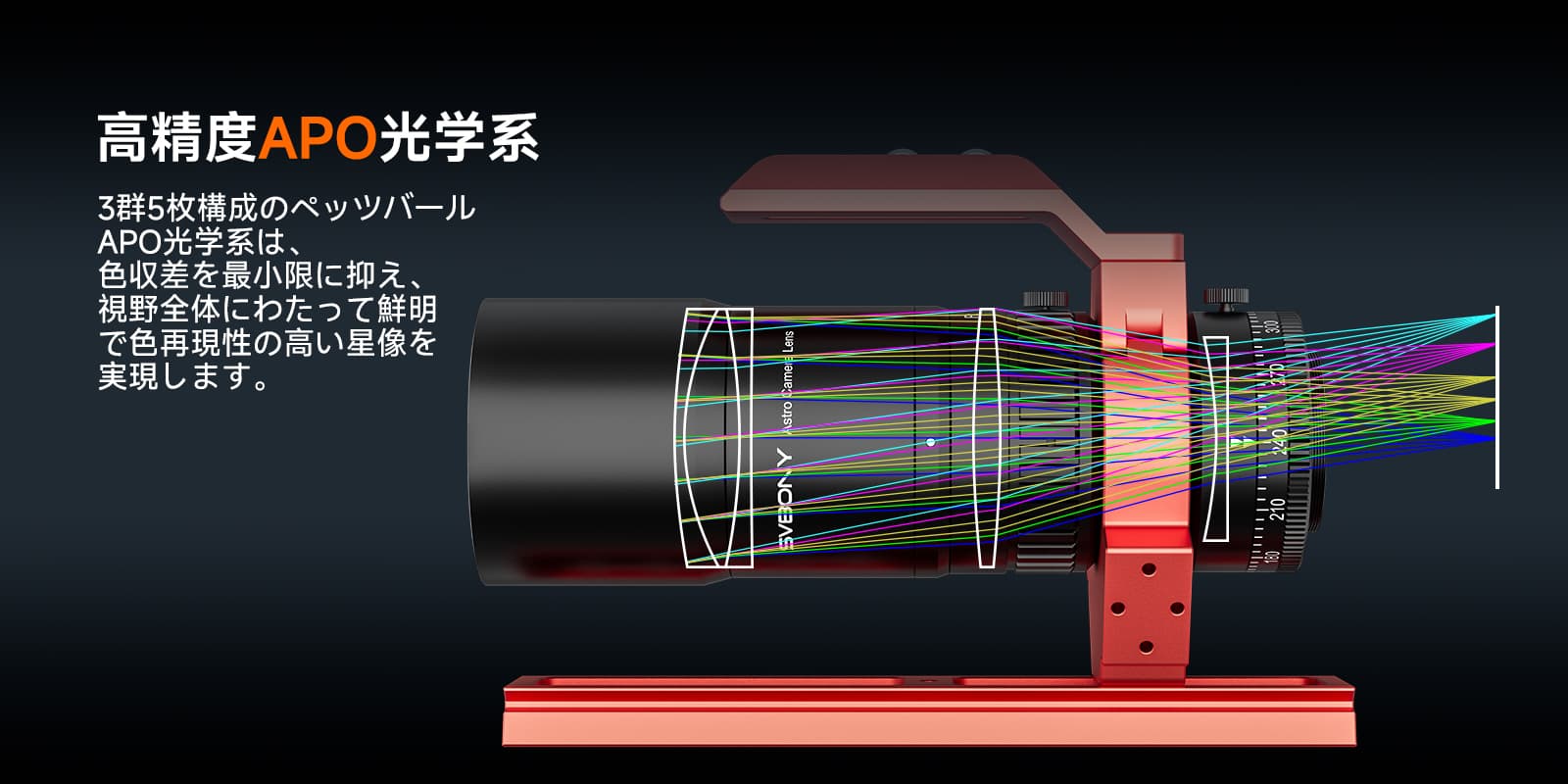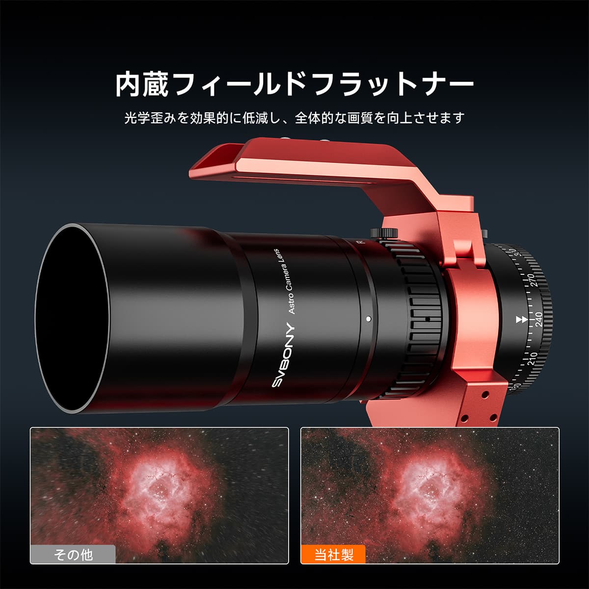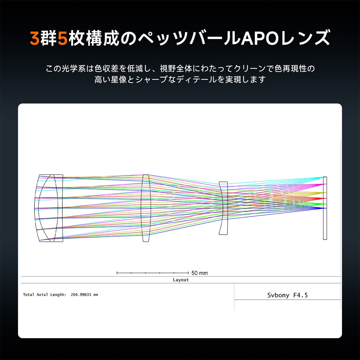 【画質向上】SV545 f/4.5 APO写真望遠鏡は、3群5枚構成のPetzval対物レンズを搭載し、より鮮明な画像を実現します。内蔵のフィールドフラットナーは、コマ収差などの収差を効果的に除去します。
