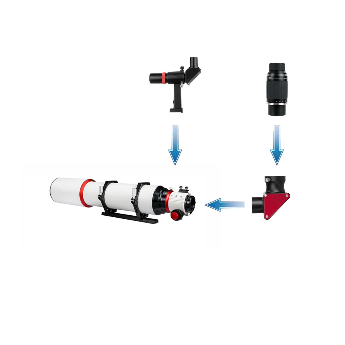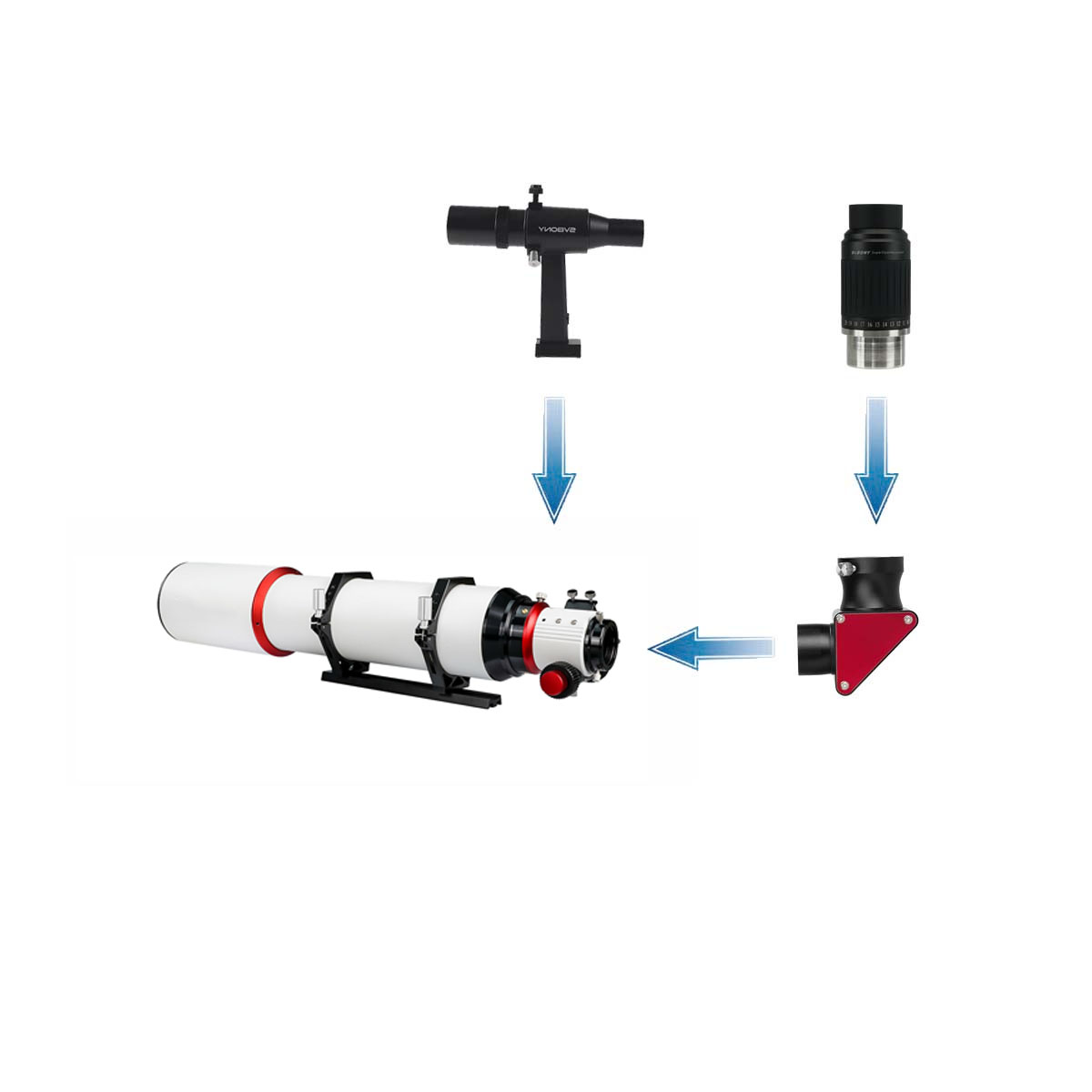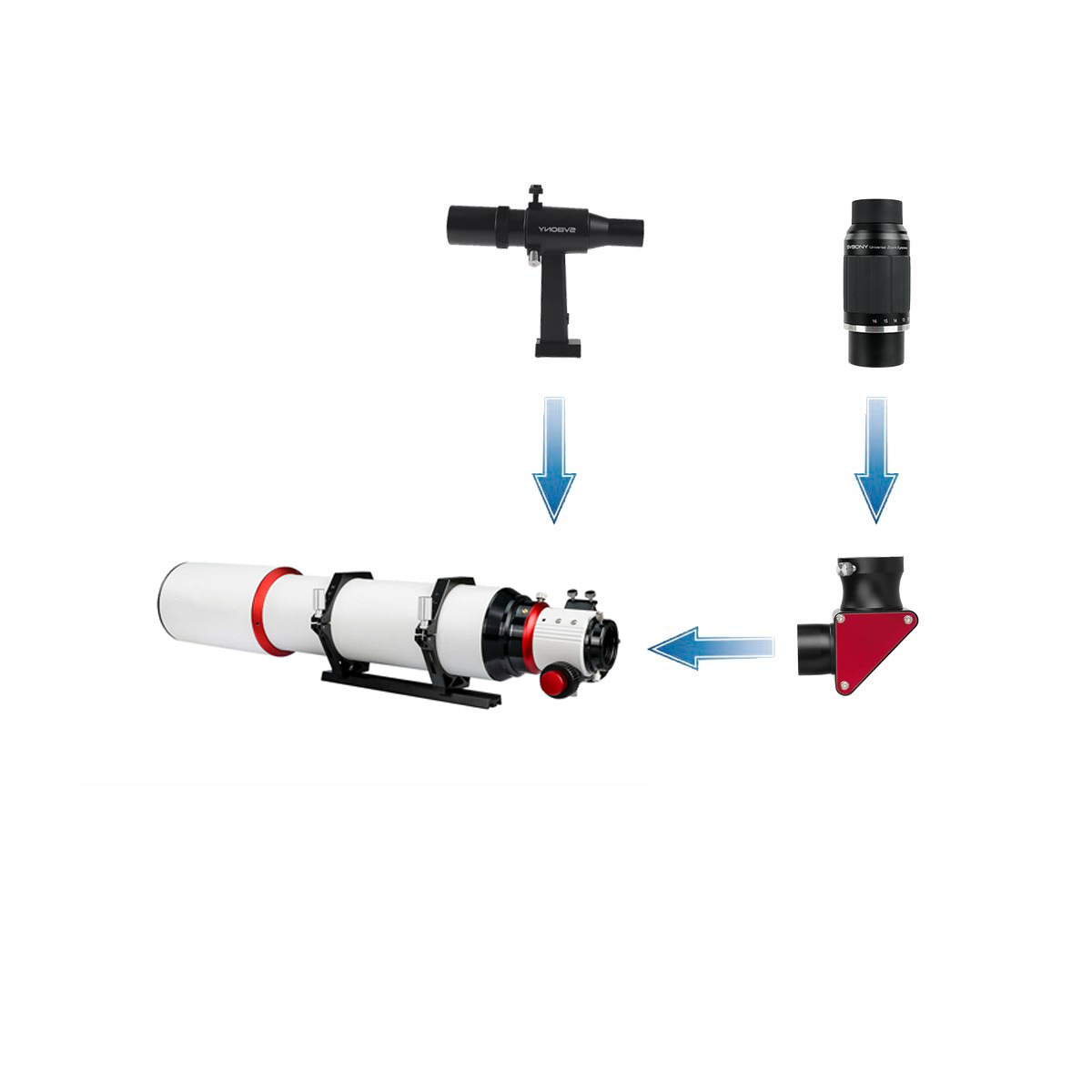 セット3:SV550 122mmの標準付属品に加えて「SV223天頂ミラー」「SV211 CNC仕上げ鏡筒ハンドル」「SV230ズームアイピース」「SV182 正立ファインダー」が付属