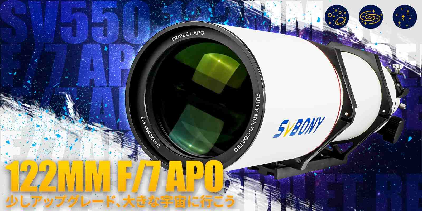 SV550望遠鏡は口径 122mm、焦点比 f/7、焦点距離 854mm のFPL51三枚玉にあるコンパクトな屈折望遠鏡です。目標天体の写真や観測に最適で 、OTA の重量はわずか 6.44kgで、携帯便利です。SV550APO屈折望遠鏡は122mmの口径を備えており、更なる多くの光を集め、限界等級が高いため、銀河、星雲、星団やDSOの目標天体などの撮影や観測に適し、より鮮明でシャープな画像をもらえます。