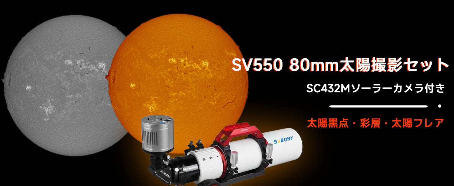 1 | ReviewsSV550 80mm太陽観測セットで、SC432MソーラーカメラとSV229ソーラーフィルターが付属しています。SC432M は画素読み出しの際に被写体が歪まないグローバルシャッター搭載のセンサーので、太陽面や月面やその外の高速度撮影に有利です。