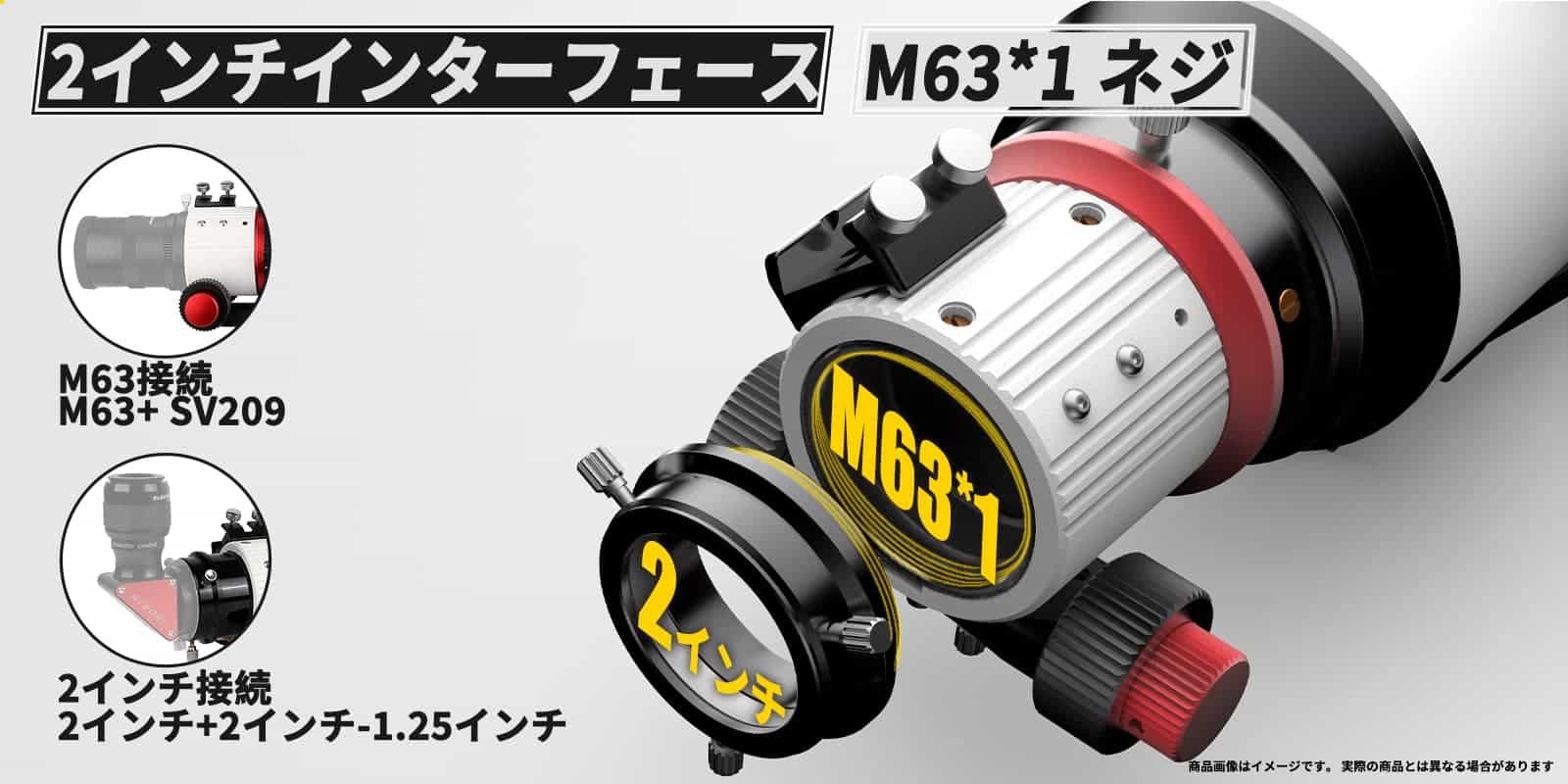 SV550 屈折望遠鏡は 2 インチおよび M63*1 アクセサリと互換性があります。前面には、カメラまたは 2 インチのアクセサリを接続するための 2 インチのアダプタです。アダプタを回転させて外すと、ここに M63*1 のネジが切られ、SV219 フィールドフラットナーまたはその他の M63*1 アクセサリを接続します。