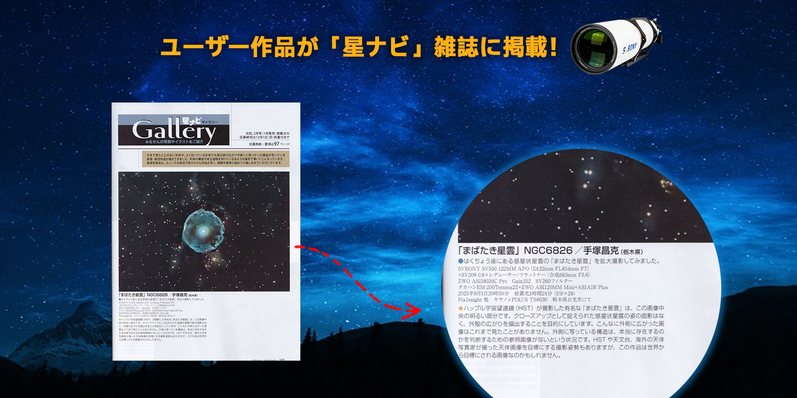 この度、当社の製品SV550 122mm望遠鏡とSV260フィルターをお使いのお客様の写真作品が、専門誌『星ナビ』に掲載されました。手塚昌克様、雑誌掲載、誠におめでとうございます。今後とも、皆様の天体写真ライフをサポートしてまいります。