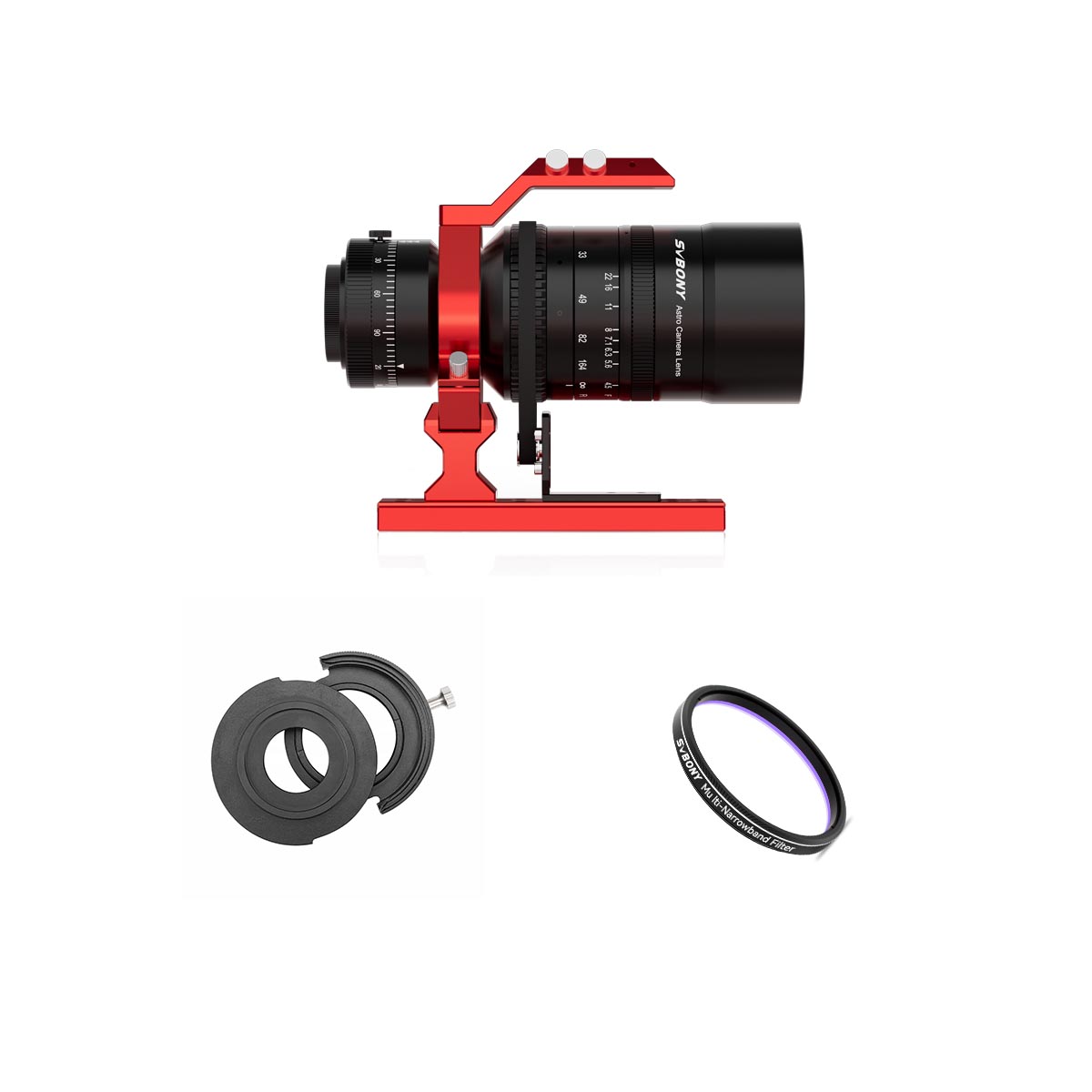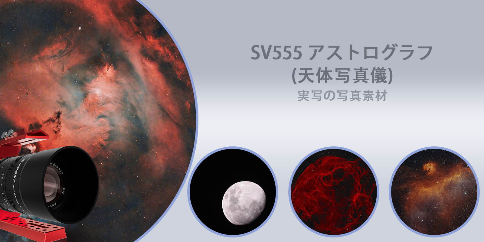SV555は口径54mm、f/4.5-f/22アストログラフで、写真撮影を目的とする天体望遠鏡です。中心から 周辺まで結像性能は非常に高く、天体写真に適しています。