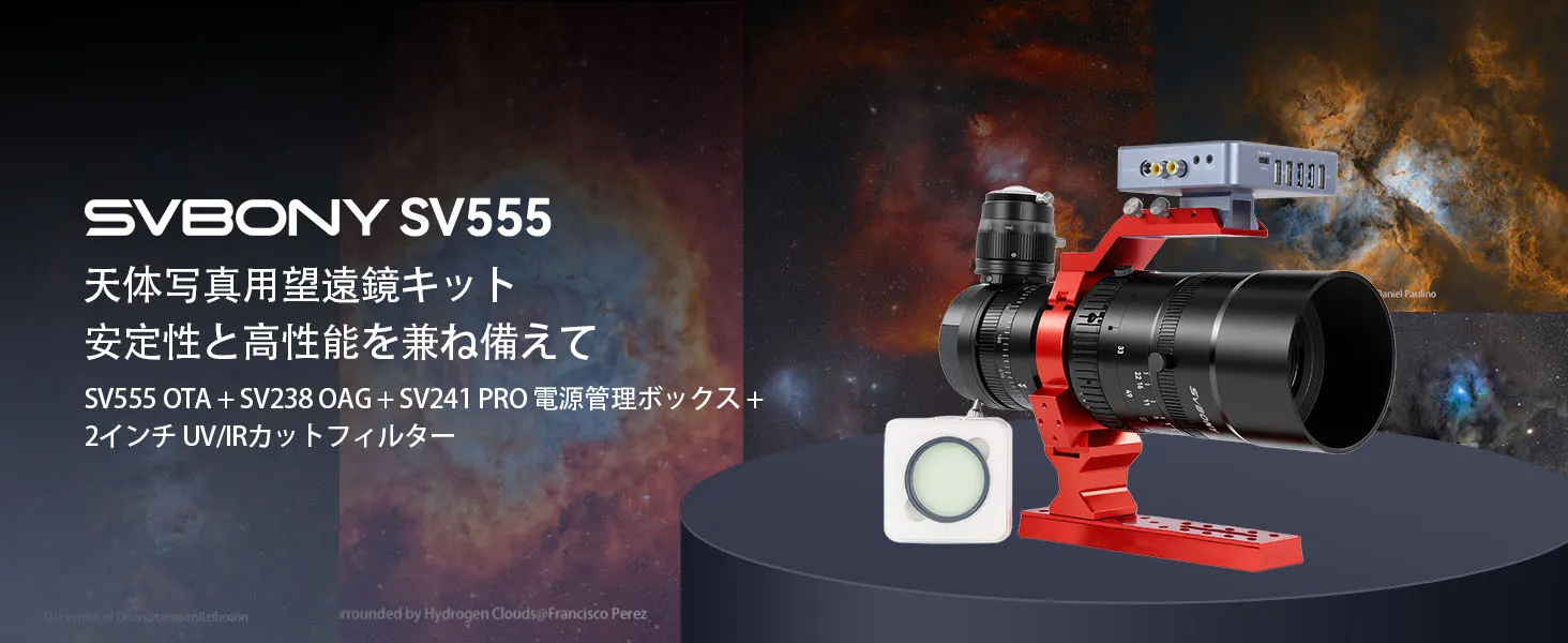 深宇宙撮影に特化したSV555 天体写真望遠鏡キットです。SV555 アストログラフ、SV238 オフアキシスガイダー、SV241Pro電源管理ボックス、2インチUV/IRカットフィルターを含むシステム統合とプロ仕様の性能を両立。SV555 アストログラフはプロ級の画像品質と完璧な星像を実現。SV238 OAGは精密なガイドを保証し、SV241Proはリモート電源操作で効率的な管理を可能にし、深宇宙撮影の高度な要求を全面的に満たします。