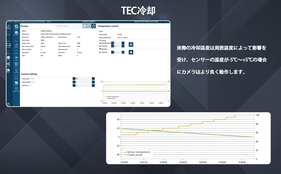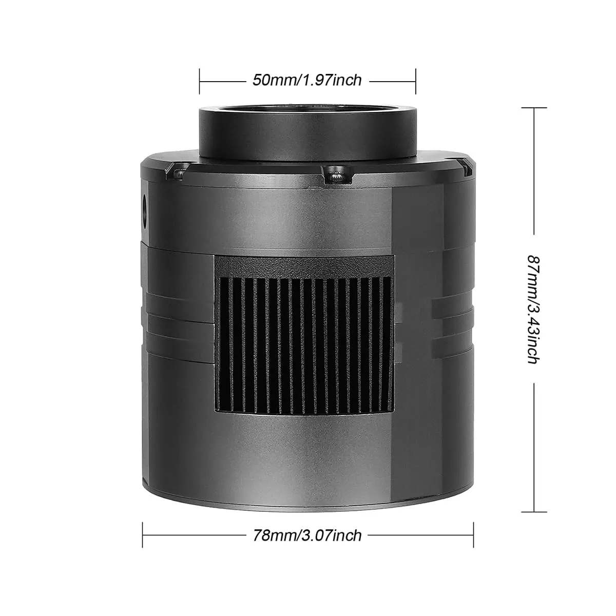 - 2、2段階サーモエレクトリッククーラーにより、CMOSセンサーを周囲温度より30℃低く冷却します。暗電流を大幅に減少させることで、数百秒の長時間露光でもノイズが少ないです。注意:冷却等での電力消費を賄うために十分な容量を持つDC12Vの外部電源が必要です。
