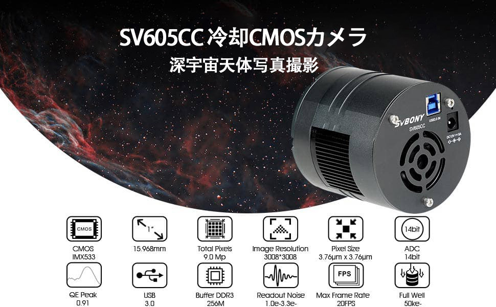 - 1、SV605CC 冷却カラー天文カメラは、裏面照射型IMX533センサーを採用し、宇宙の天体撮影に適した1インチスクエアセンサーを搭載しています。画素サイズ3.76 μm、14bitデジタル出力によって、1.0eの低読み出しノイズ、20フレーム毎秒という高速で有効画素数9メガピクセルの信号を読み出すこと可能です。深宇宙天体撮影の初心者にお勧めのモデルです。