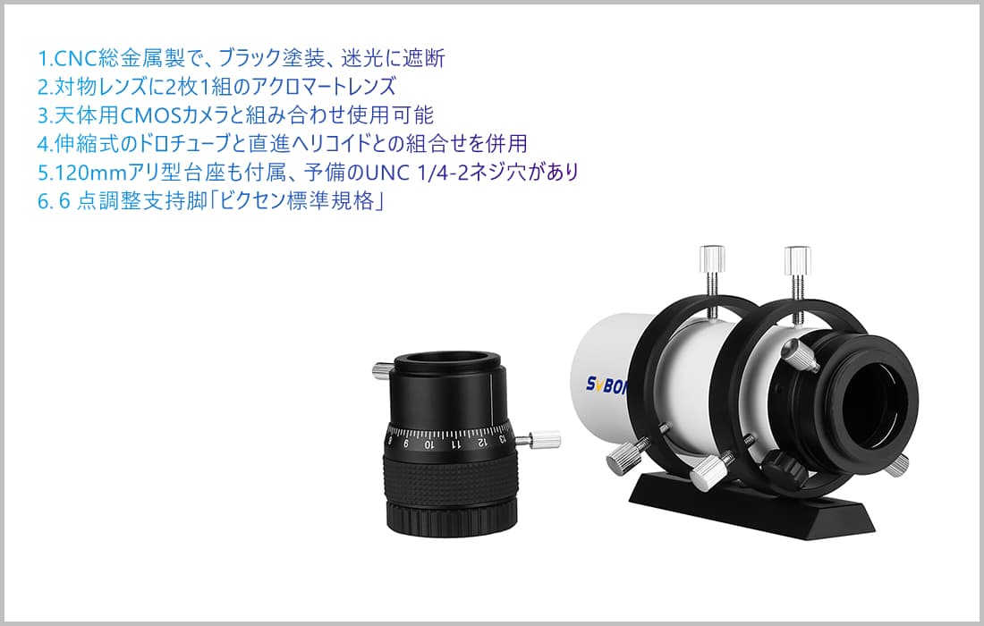 宇宙を自然体「正立」で見せて、高精度50mm口径の90度正立像ファインダーです。マルチコーティング、すべてにおいて高度な仕上げと、頑丈なファインダー脚が付属。フォーカス調整は対物側、接眼側独立して調整可能で、対物側は本体胴体部の調整機構で、レチクル側も接眼レンズの回転によって調整可能です。