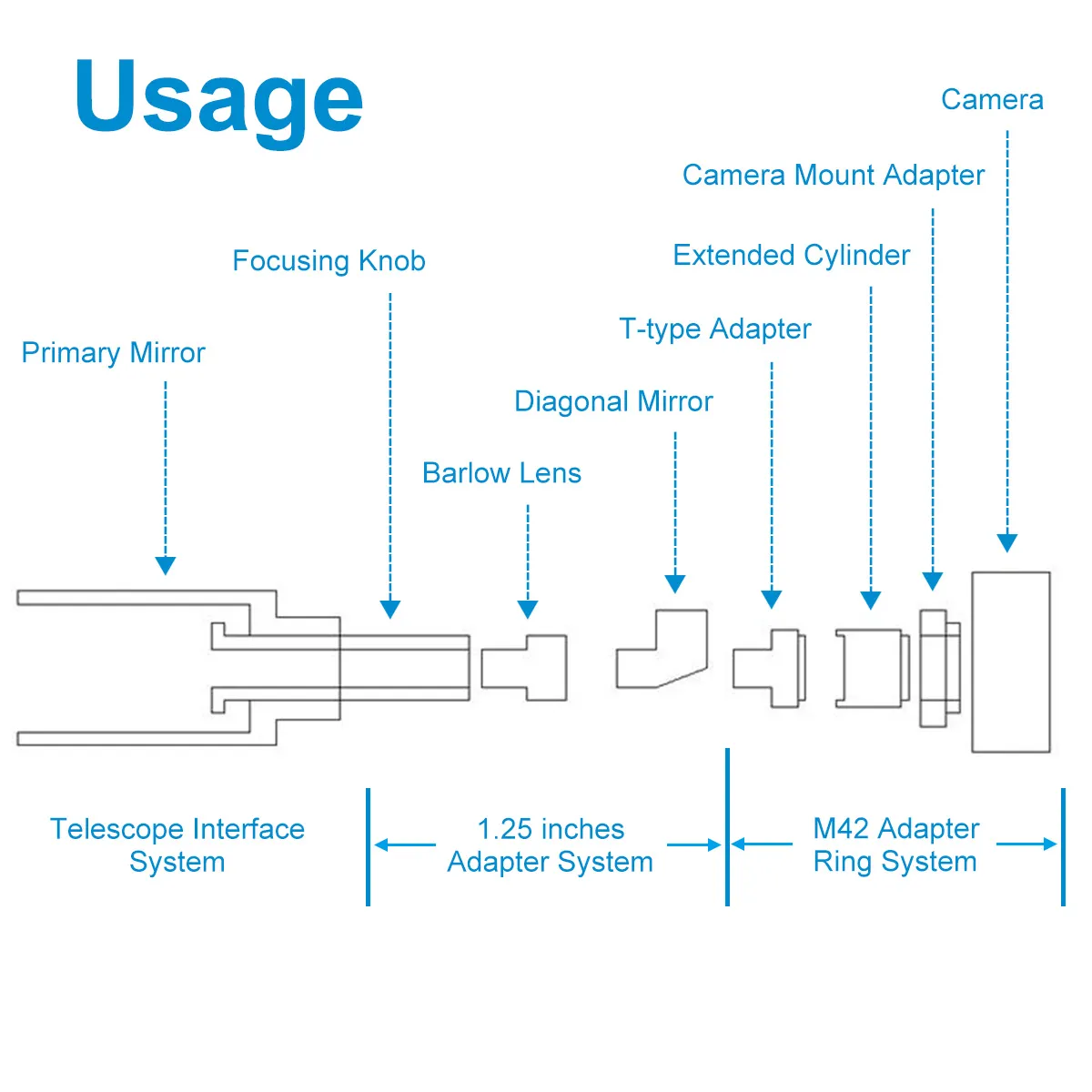1、直径1.25インチTアダプター:すべての標準の1.25インチ望遠鏡および顕微鏡に適合。