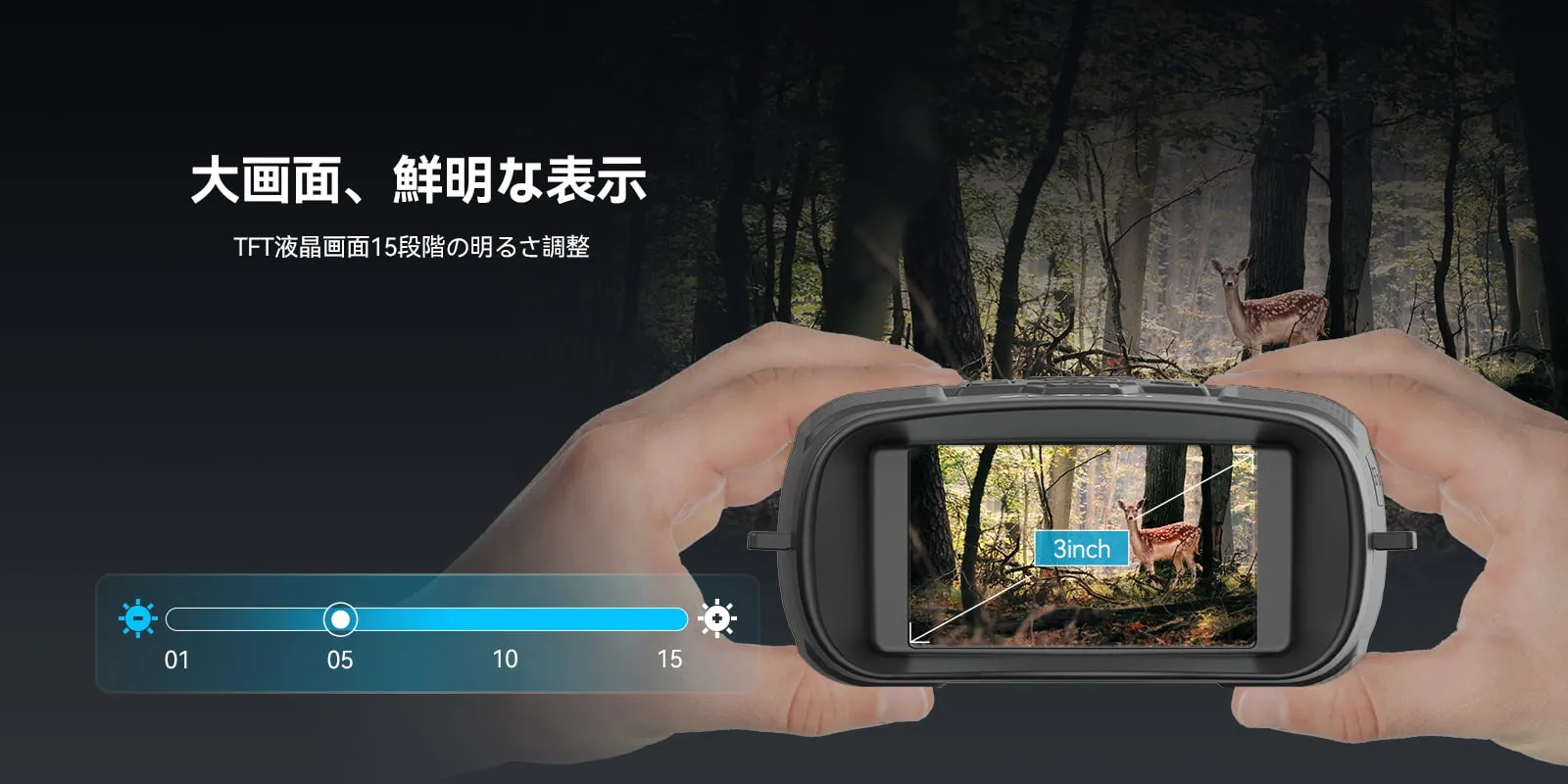 大きな画面で広い視野を提供します。 15段階の明るさで、周囲の明るさの変化に応じて明るさを自由に調整できます。