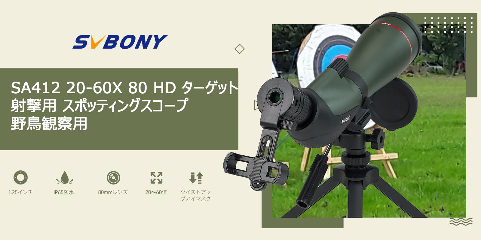 SA412は20-60x 無段階ズーム、さまざまな撮影対象距離の結果の取得と確認の要件を満たすフィールドスコープです。野生動物や野鳥の観察、天体観察、アーチェリーや射撃の標的確認など幅広く利用できます。