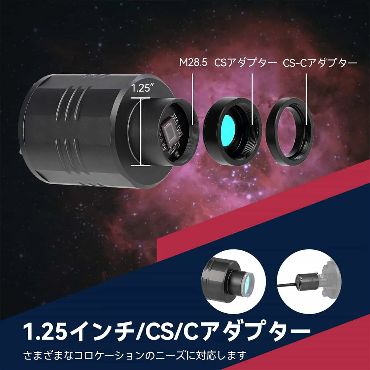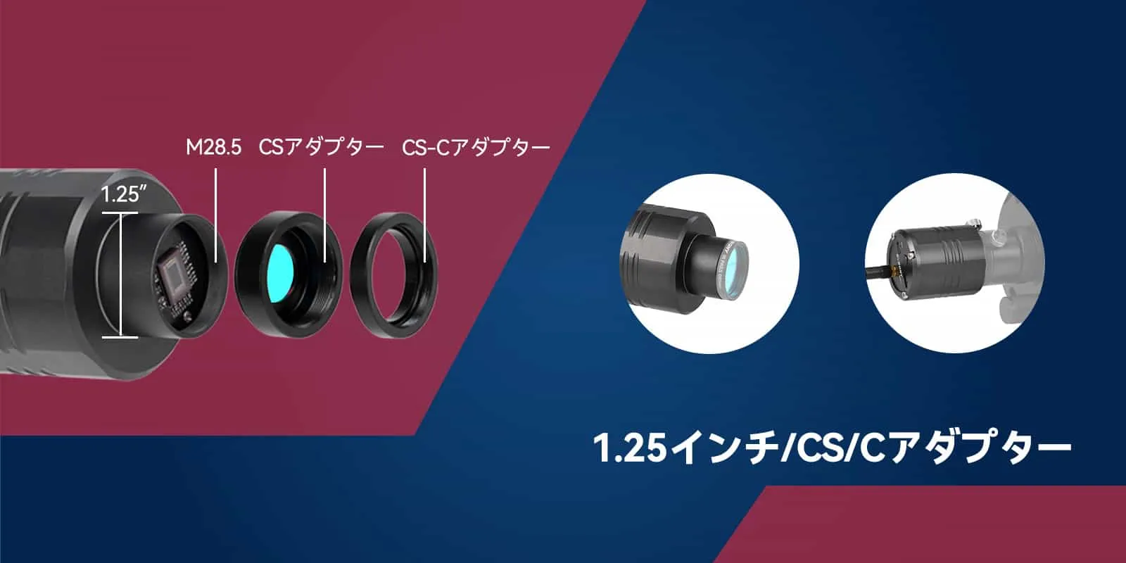 1.25インチ/CS/Cアダプターリングを搭載し、様々なニーズに対応します。 アダプターを別途購入する必要がなく、フィルターやカメラレンズを取り付けることができます。