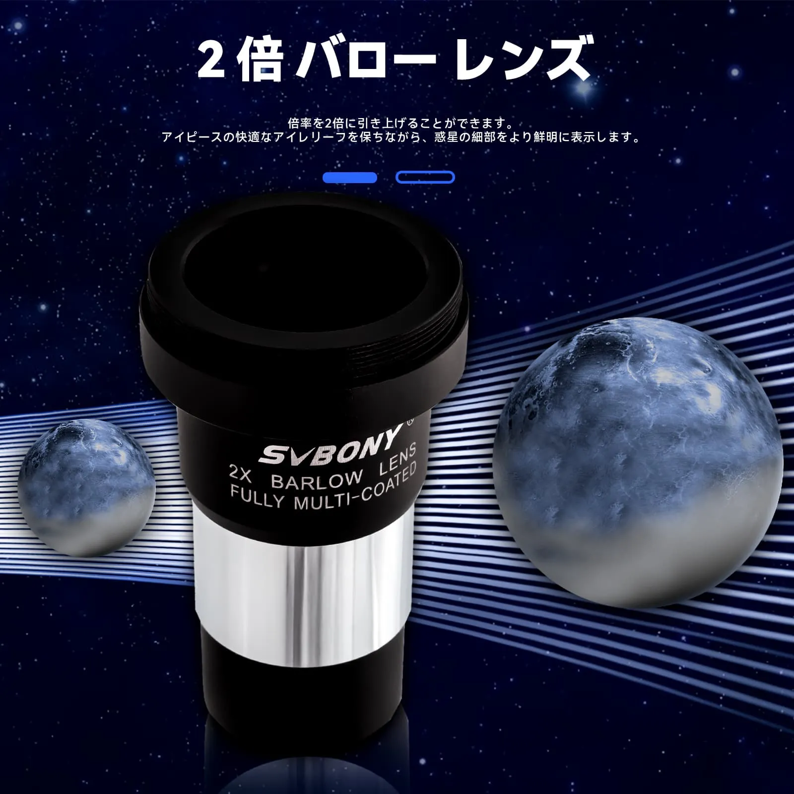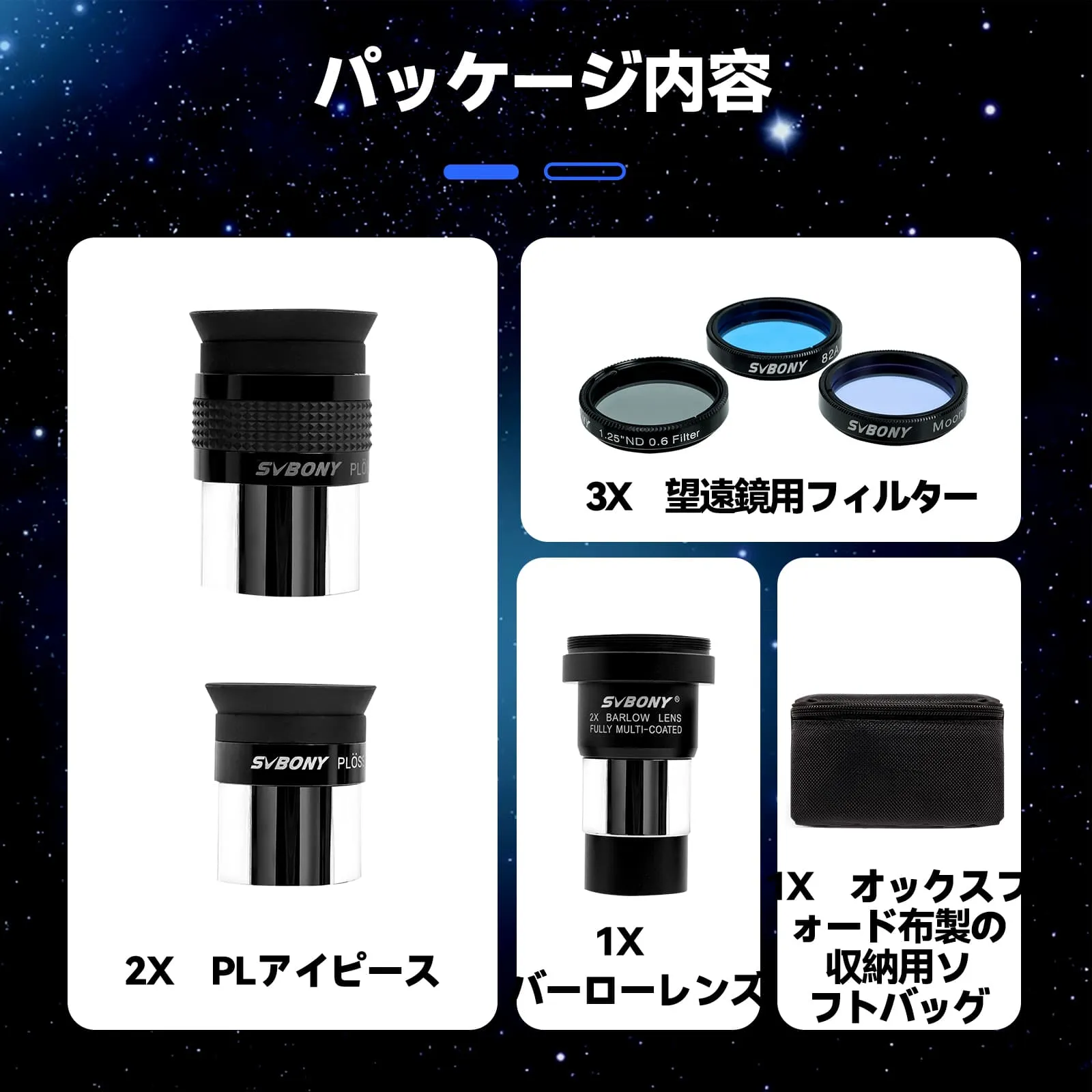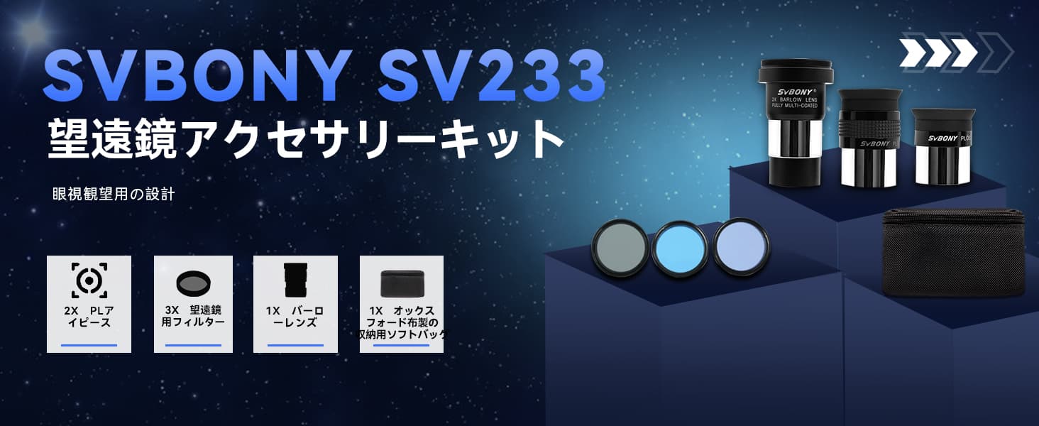 2 | ReviewsSVBONY 7 ピース アクセサリー キットには、高品質の 1.25 インチ Plossl 接眼レンズ 2 個、 2 倍バロー レンズ 1 個、 フィルター 3 個、ポータブル バッグ 1 個が含まれています。