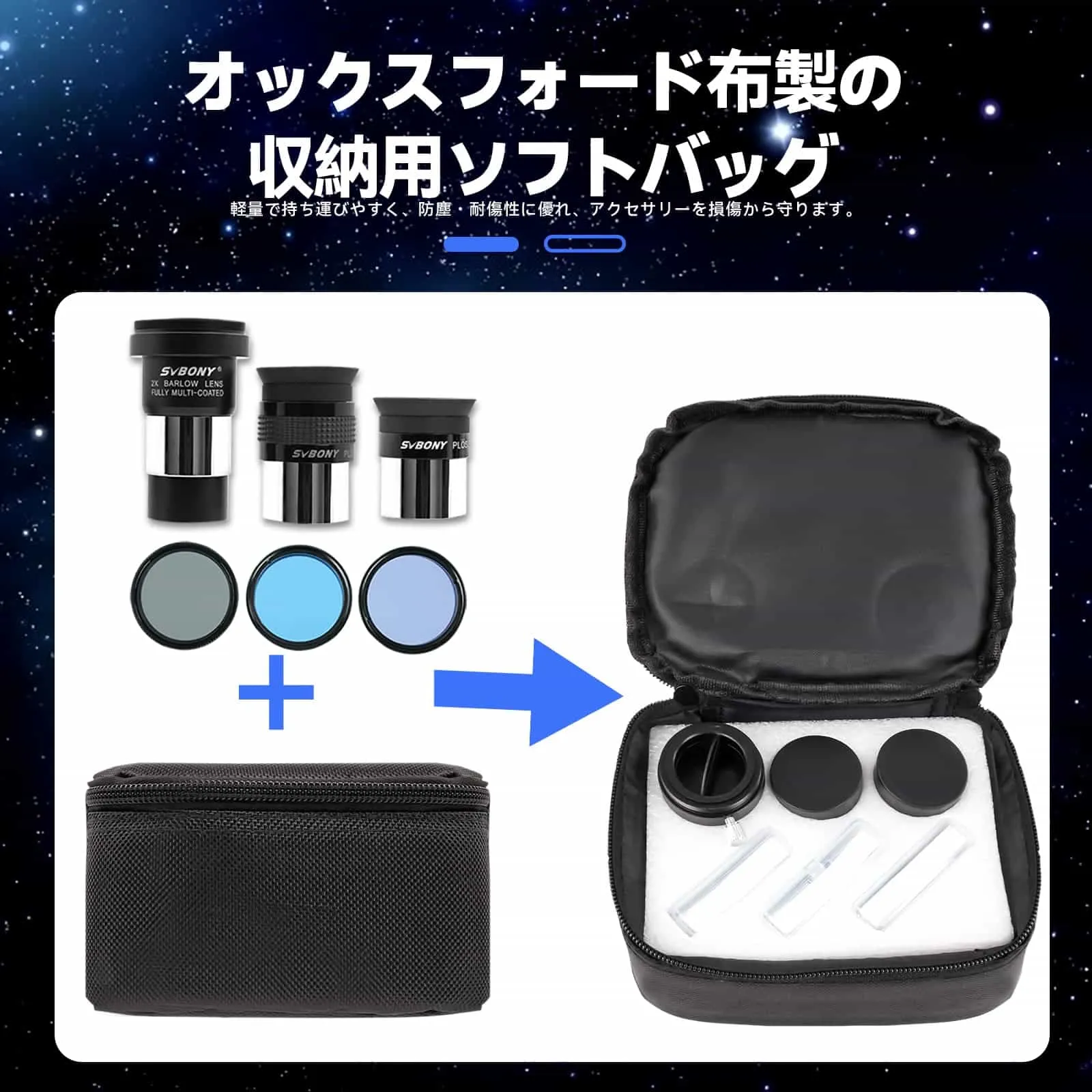 SVBONY 7 ピース アクセサリー キットには、高品質の 1.25 インチ Plossl 接眼レンズ 2 個、 2 倍バロー レンズ 1 個、 フィルター 3 個、ポータブル バッグ 1 個が含まれています。