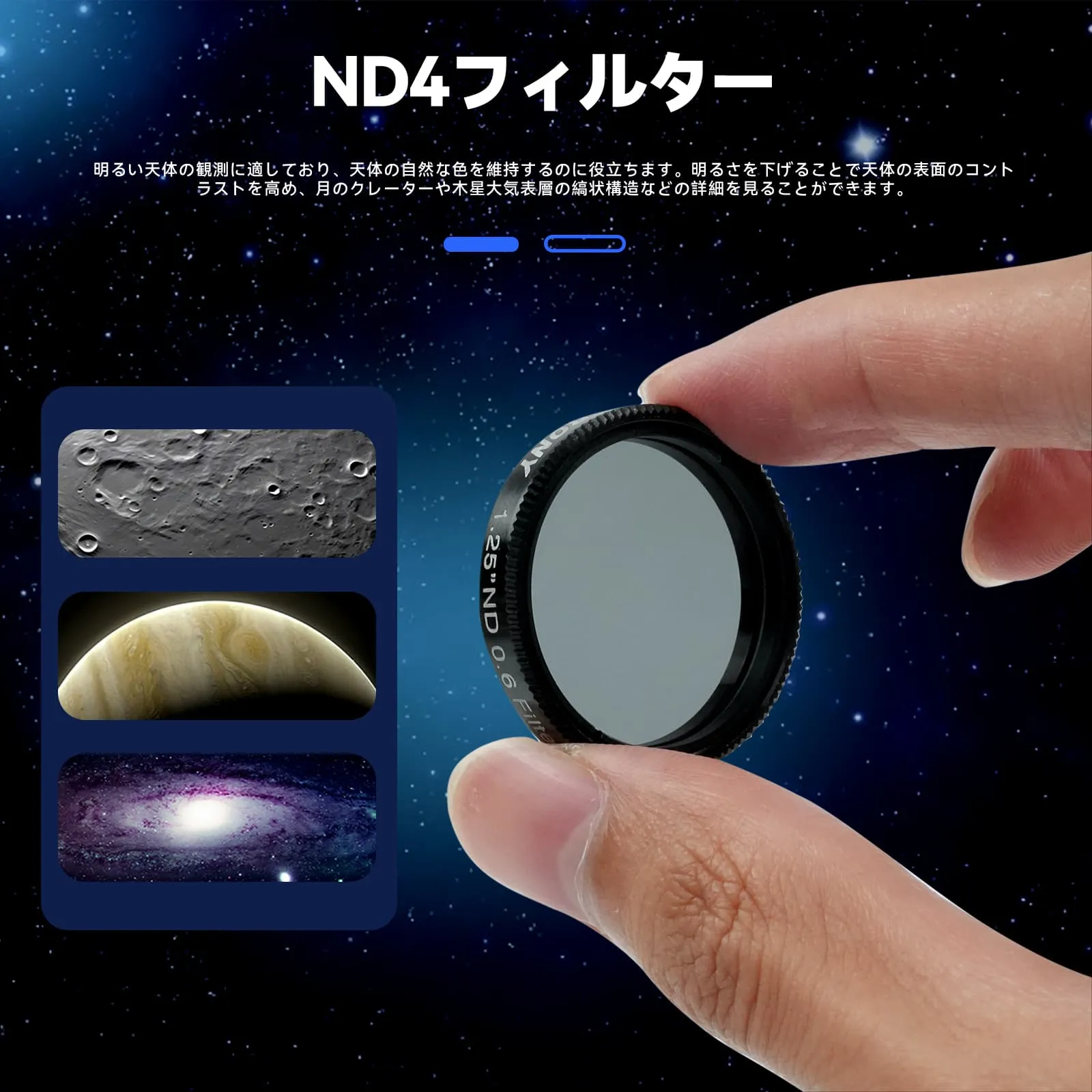 ND4 25% 光透過率で、明るさを減らし、グレアをカットし、月、金星、明るい二重星の鮮明度を高めます。
