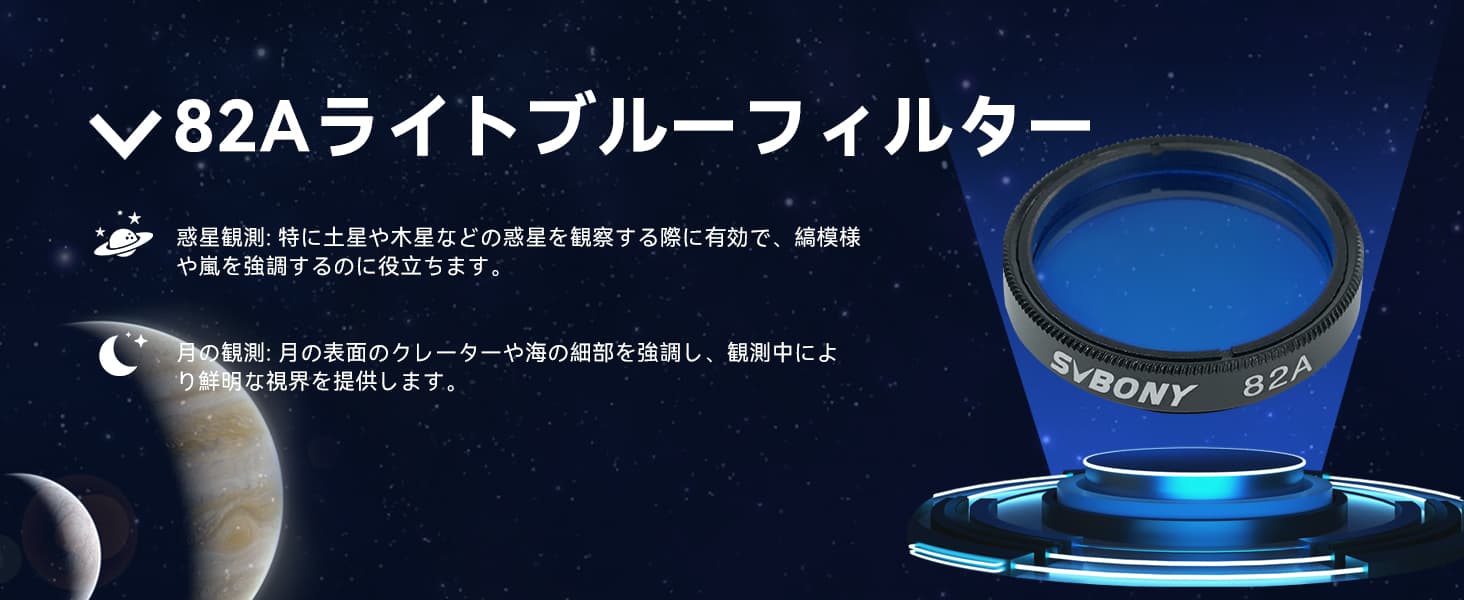 #82A カラー フィルターは、月とほとんどの惑星で使用でき、低コントラストの領域を強調しますが、観察対象の全体的な明るさを低下させることはありません。