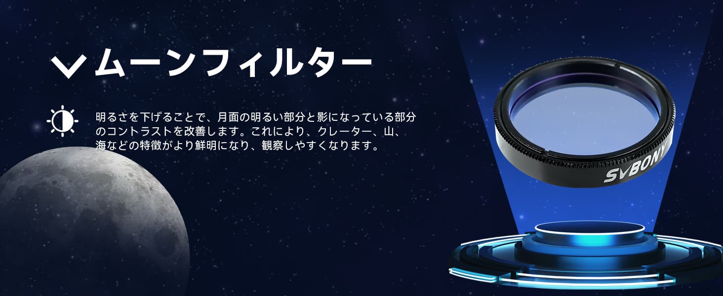 ムーン フィルターは月の自然な色を変えず、写真画像で月と惑星のコントラストを高めます。