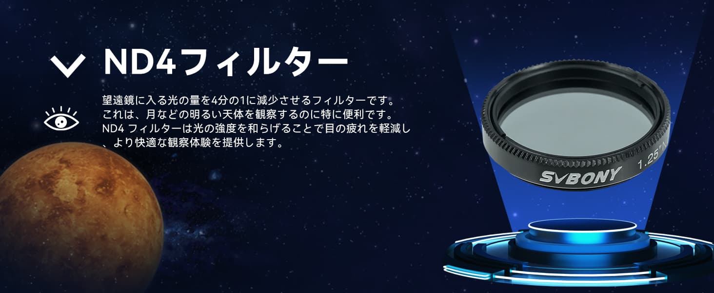 ND4 フイルターは光の強度を和らけることで目の疲れを軽減しより快適な観察体験を提供します。