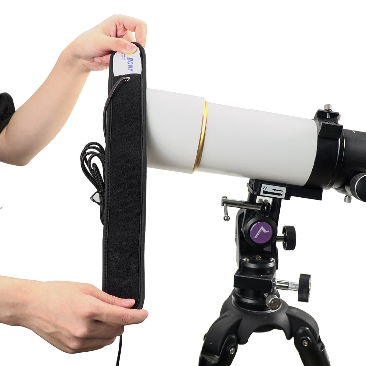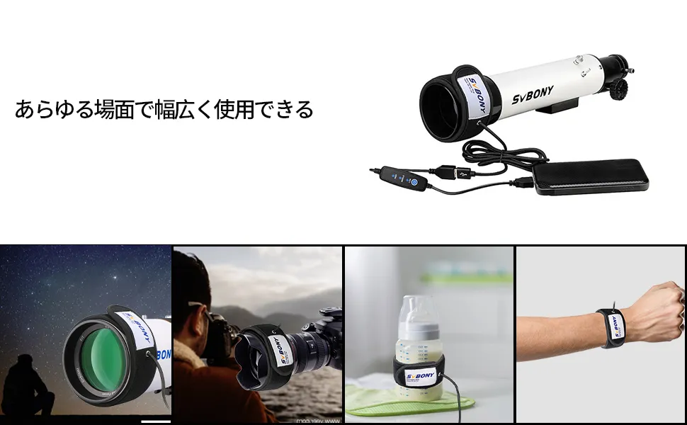 光学系に露を付けないために望遠鏡などの筒先に巻き付けて使用します。USB給電式。