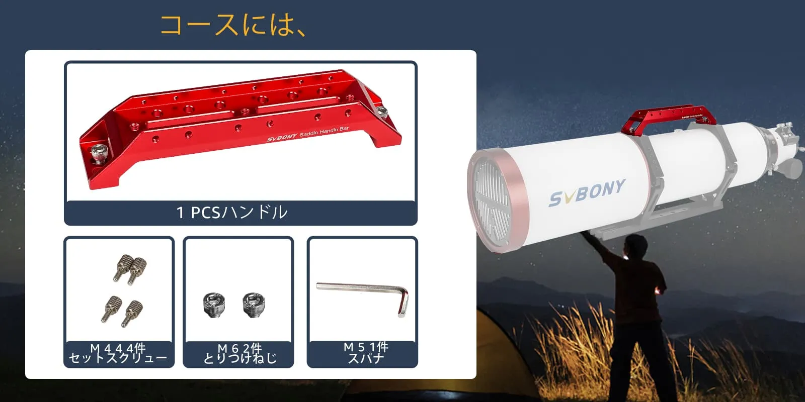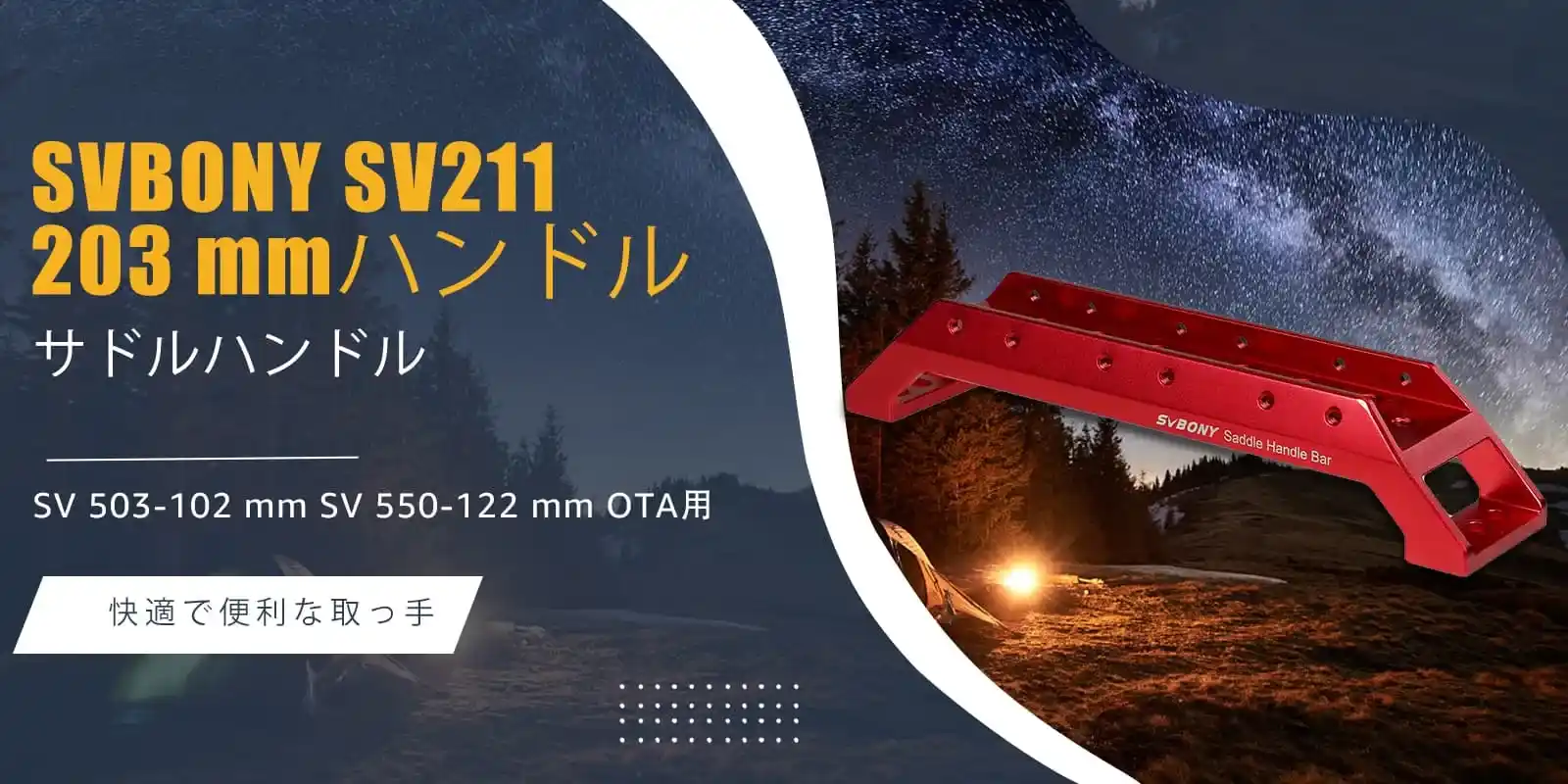 快適で便利な鏡筒ハンドルです。SV211本体は精度の高いCNC(コンピューター数値制御)仕上げで、耐久性のあるアルマイト素材を使用していますので、大口径望遠鏡にも安心して使うことが出来ます。このSV211鏡筒ハンドルSV503 102mm&SV550 122mmに対応しています。