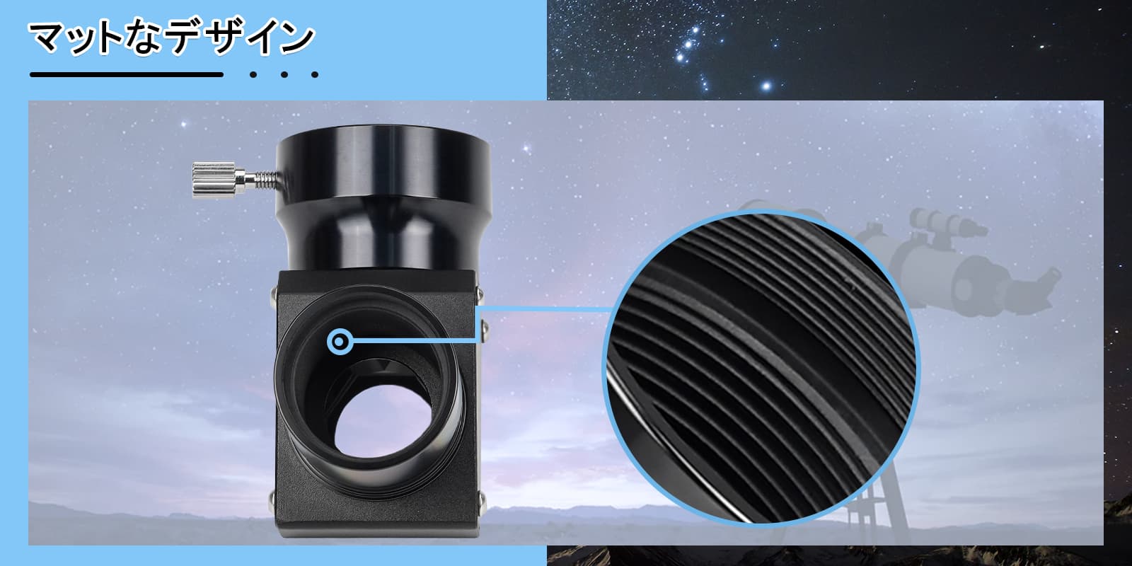 2.全体がアルミニウム製、黒色陽極酸化処理された接眼レンズホルダー、大型のクロムメッキ蝶ネジ。