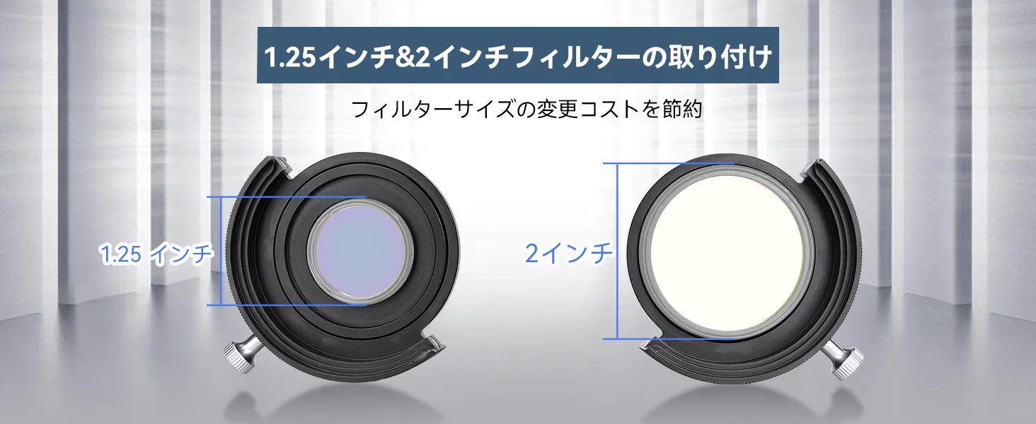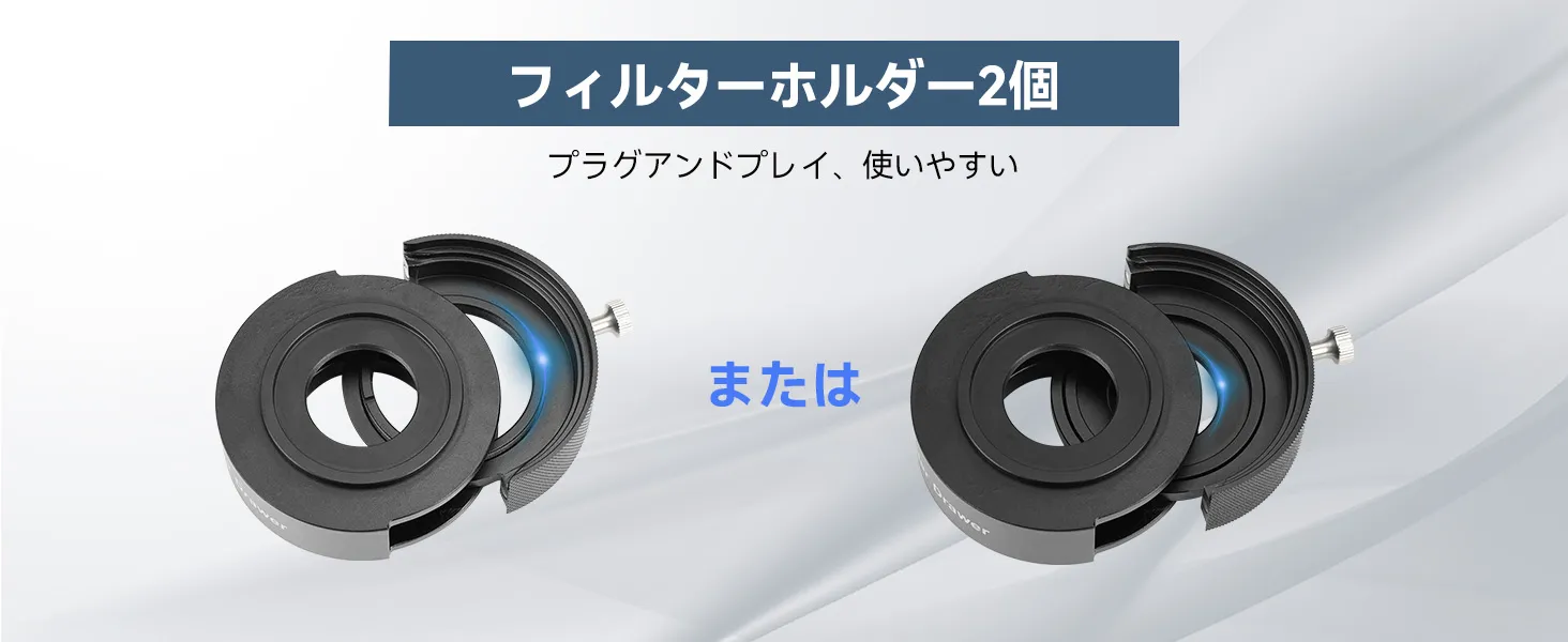 2つのフィルターホルダー:標準の 1.25 インチおよび 2 インチのフィルターホルダー。 プラグ&プレイ; 暗い環境で繰り返される分解と取り付けの手順を削減します。