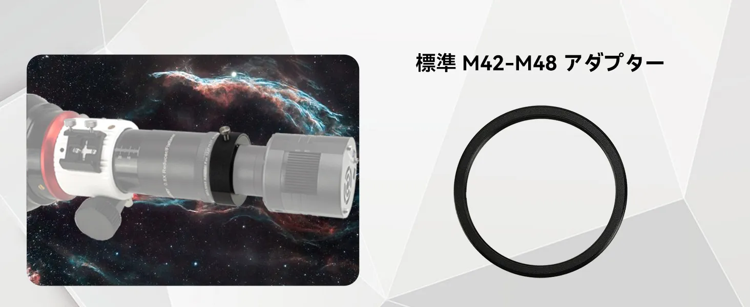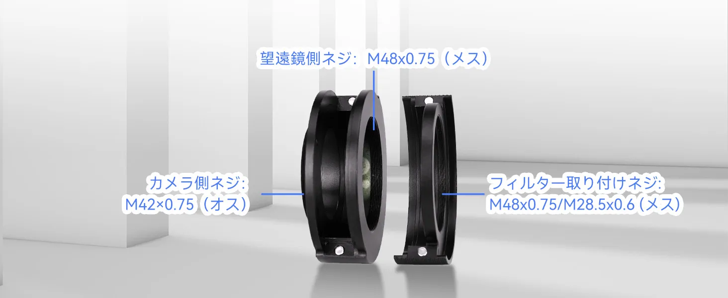 M42-M48アダプター:カメラ側のネジはオスです。 フィルター取り付けネジはメスです。 アダプターを使用して、異なる仕様のカメラを接続できます。