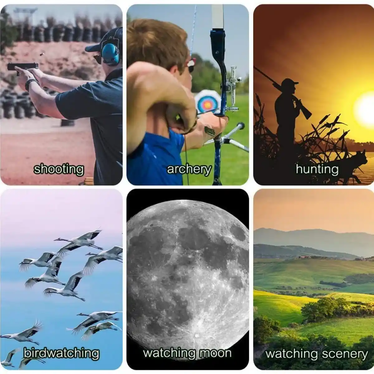 三脚ホルダー、収納バッグ、ネックストラップ、レンズクレンジングクロース、レンズカバー、ユーザーマニュアルが付属されています。アーチェリー、野生動物の観察、観月などの星空観察でも適用します。