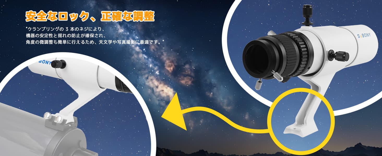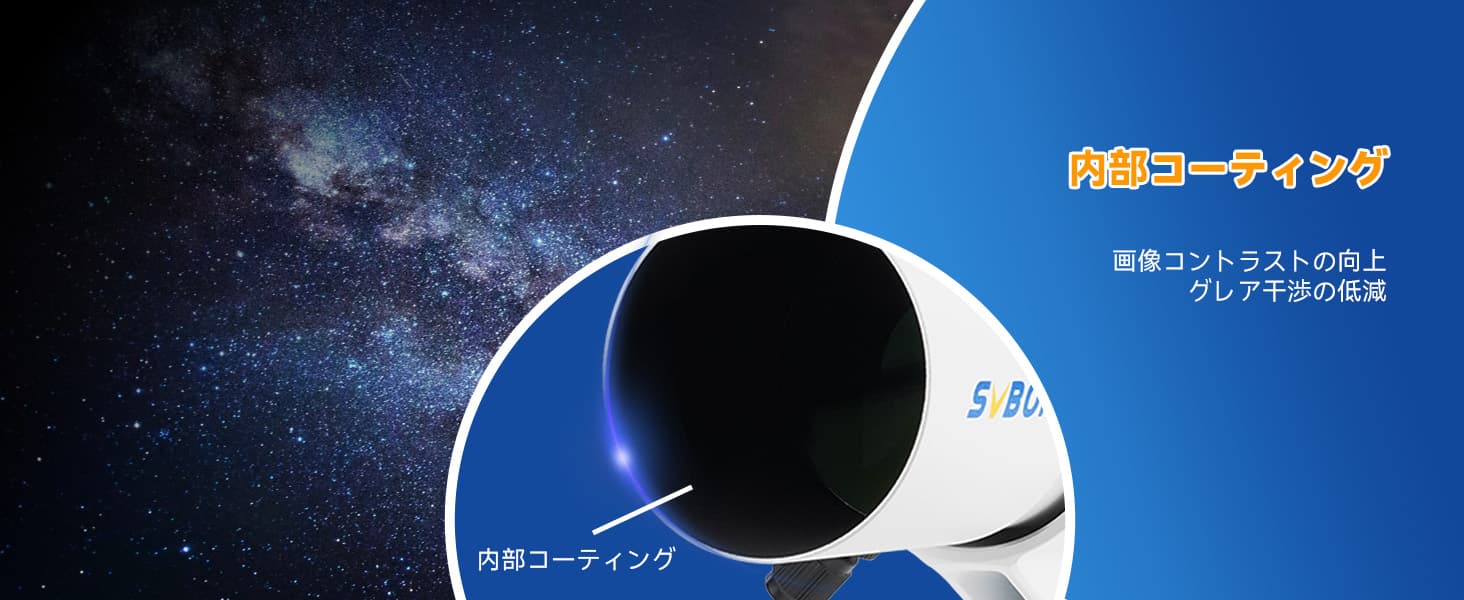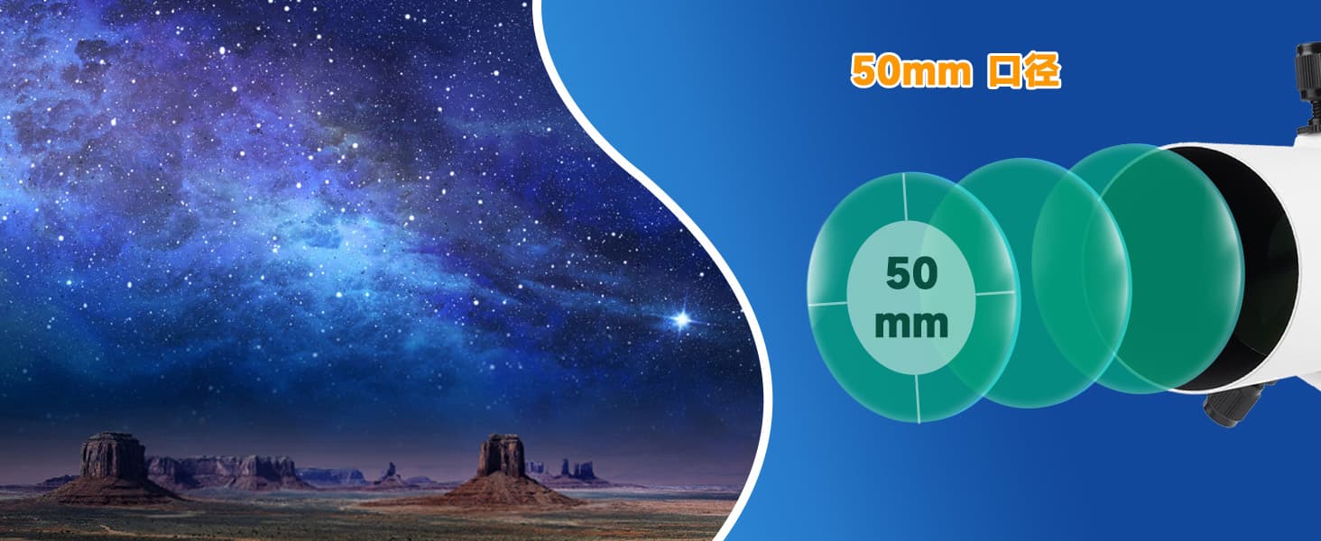 2.レンズは口径50mmです。明るく広い視野の光学系は、多くの星をとらえることができます。小型軽量のスコープは、ガイド、検索、観察、スポーティングに最適です。