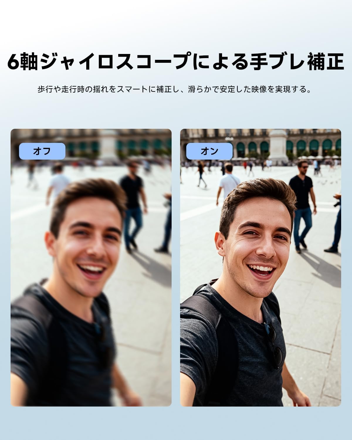 - 6軸手ブレ補正:6軸ジャイロスコープを搭載したこのミニボディカメラは、歩行や走行時の小さな振動をインテリジェントに補正します。日常の活動中でも滑らかで安定した映像を撮影できます。移動中でも鮮明で安定した映像を撮影できます。