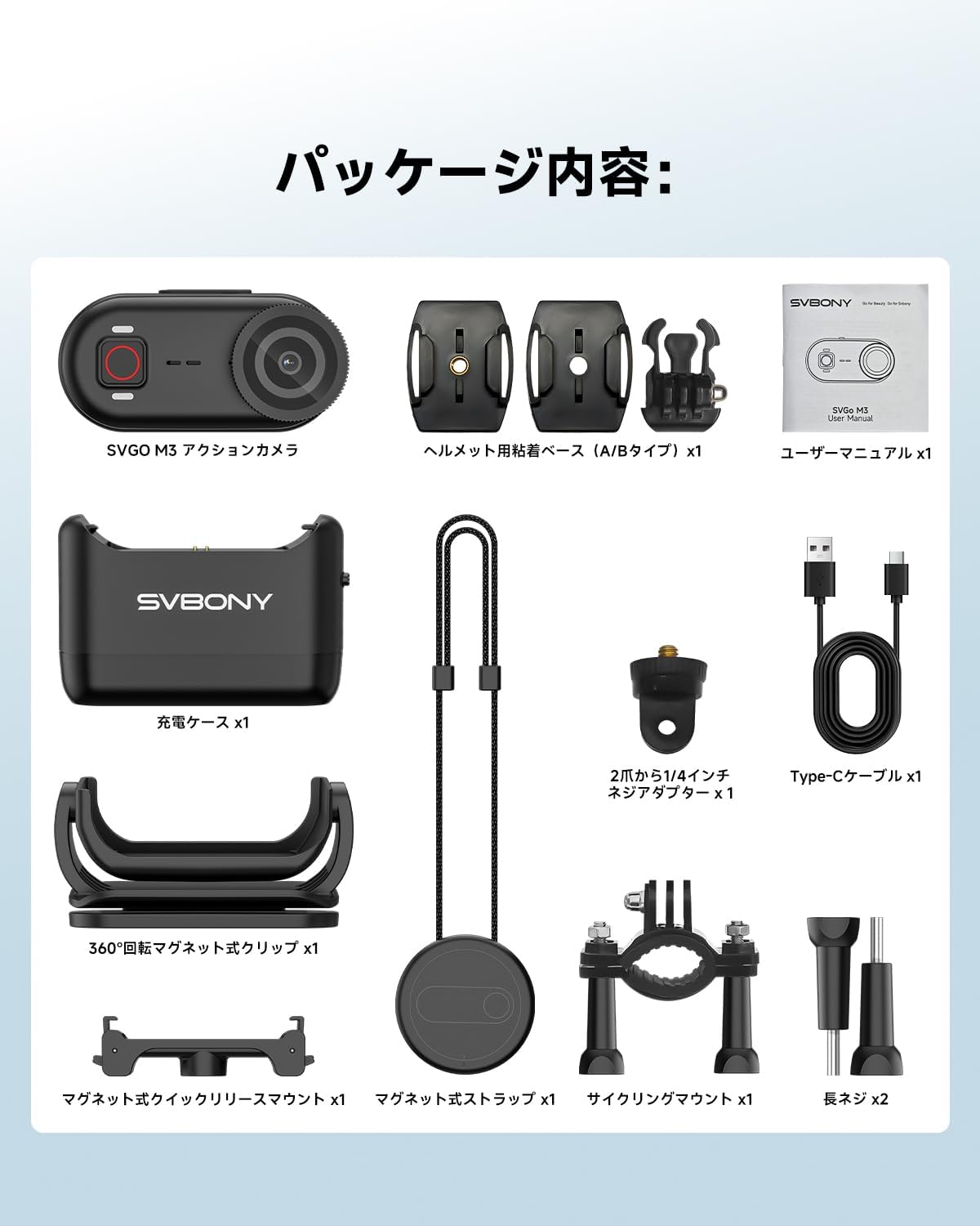 | 付属コンポーネント | 2 爪→1/4 ナット 変換アダプター ヘルメット用 AB ベース, 360 度回転 マグネットバッククリップ, Type‑C ケーブル サイクリングマウント, 取扱説明書 ヘルメット用 AB ベース, 長ネジ マグネットクイックリリースマウント2 爪→1/4 ナット 変換アダプター ヘルメット用 AB ベース, 360 度回転 マグネットバッククリップ, Type‑C ケーブル サイクリングマウント, 取扱説明書 ヘルメット用 AB ベース |