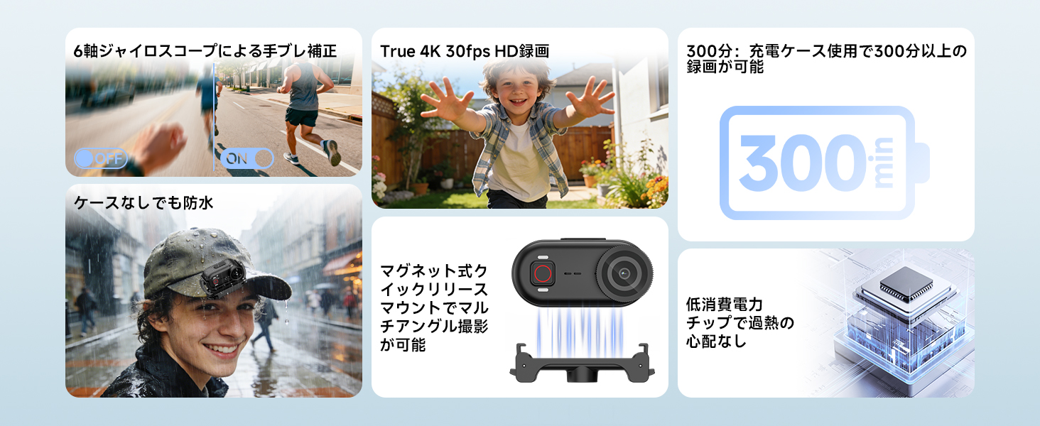 - 長持ちバッテリー:このアクションカメラは、1回の充電で最大100分の連続4K録画が可能です。充電ケースと組み合わせれば、合計300分という驚異的な駆動時間を実現。(測定条件:4K 30fps、手ブレ補正 OFF、ネットワーク機能 OFF、その他設定はデフォルト)そして充電と録画の同時実行に対応可能です。