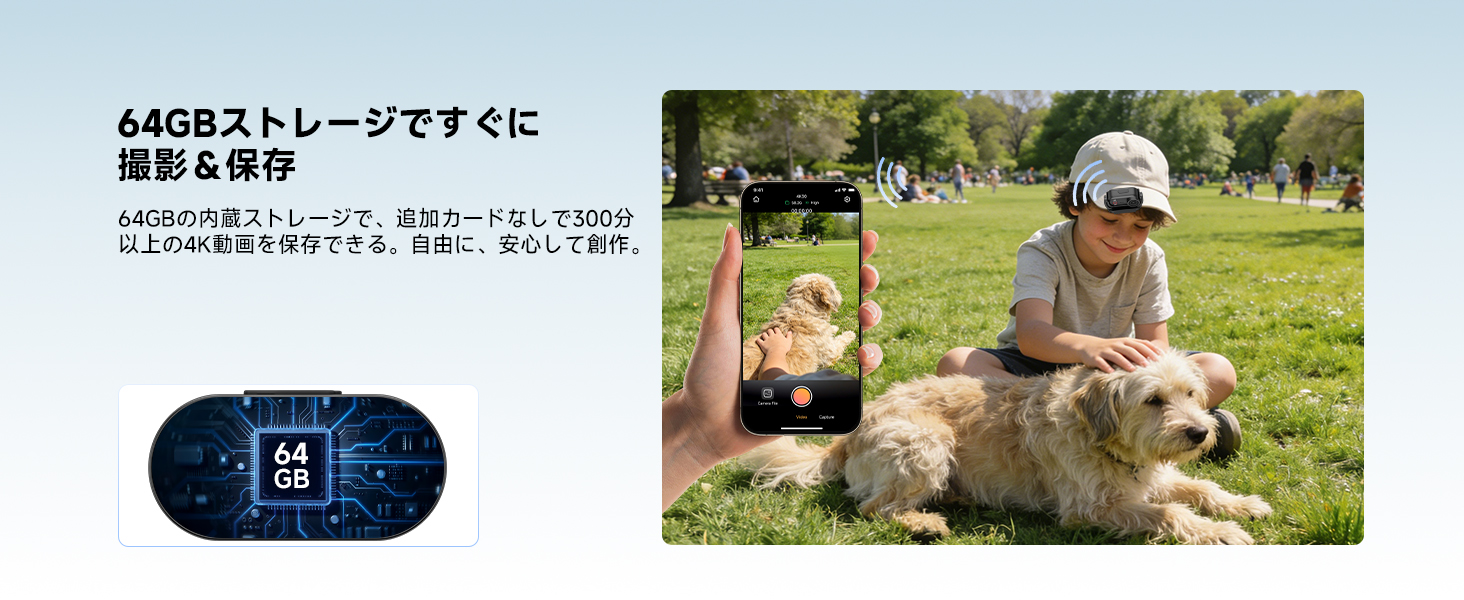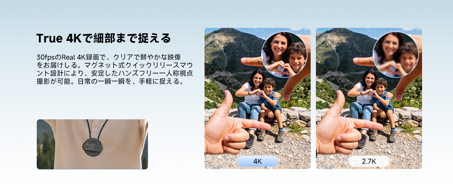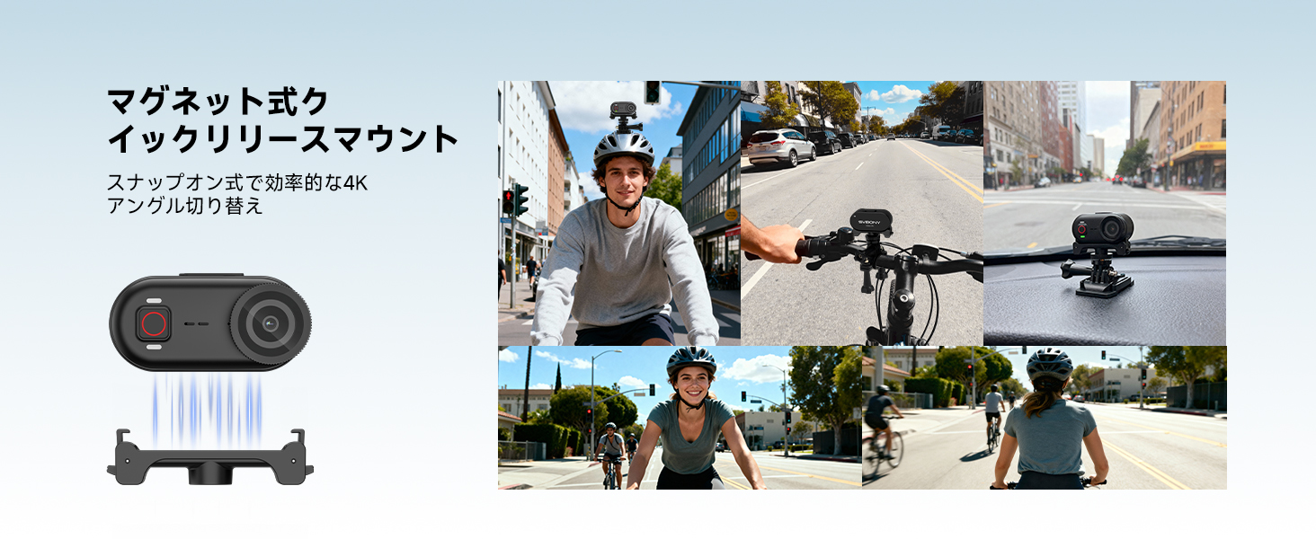 - 小さなボディで;手軽に一人称視点で撮影できるよう設計されたこのPOVカメラは、わずか43gで、装着するとまるで無重力のような感覚です。マグネット式設計により、金属面にしっかりと固定でき、安定したハンズフリー撮影を実現。クリエイティブなアングルを自由に広げます。