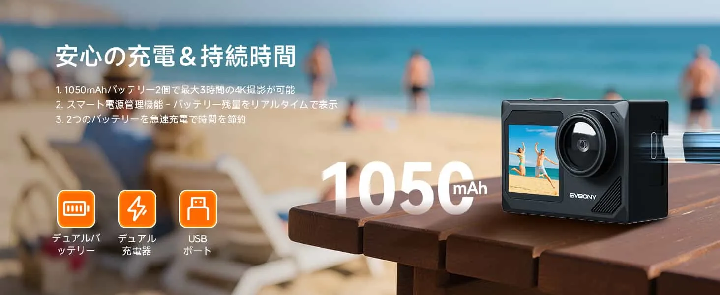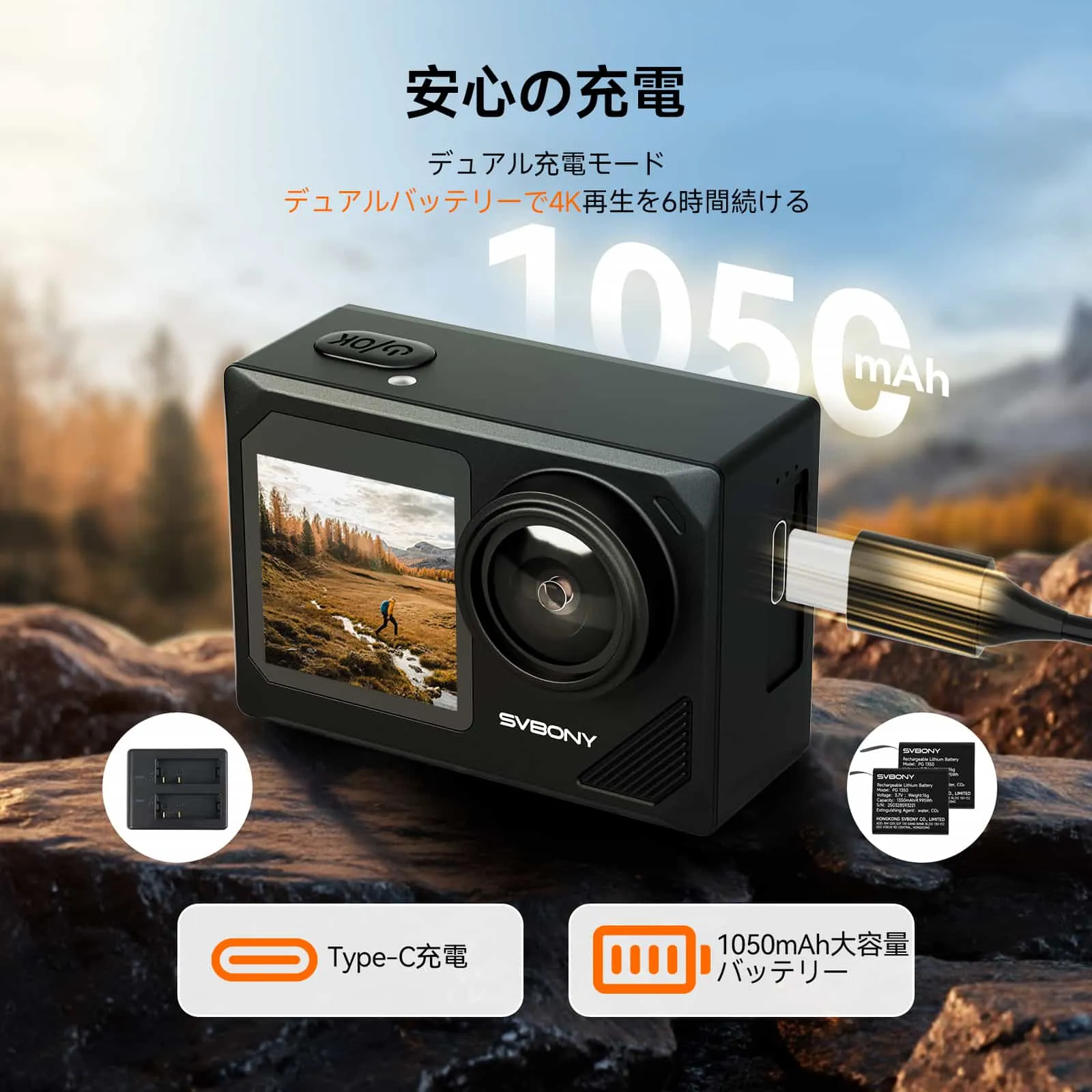 3、バッテリー性能。バッテリー2個付属で、4K撮影時でも最大3時間連続撮影可能。デュアル充電器対応:2個同時急速充電でき、待ち時間を大幅短縮。スマート電力管理システム:残量をリアルタイム表示、突然の電源切れを防止。 USB充電(モバイルバッテリー/車載充電器対応)で、外出先でもok。