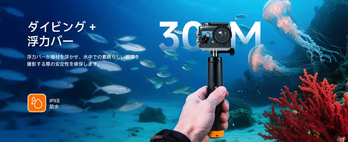 4、防水ケース30m防水。IPX8準拠。30m防水アクションカメラ。高品質のハウジングで水漏れを防止。浮力のある三脚と組み合わせることで、安定性と浮力を確保します。カメラが沈まず、水中で鮮明な映像を撮影できます。