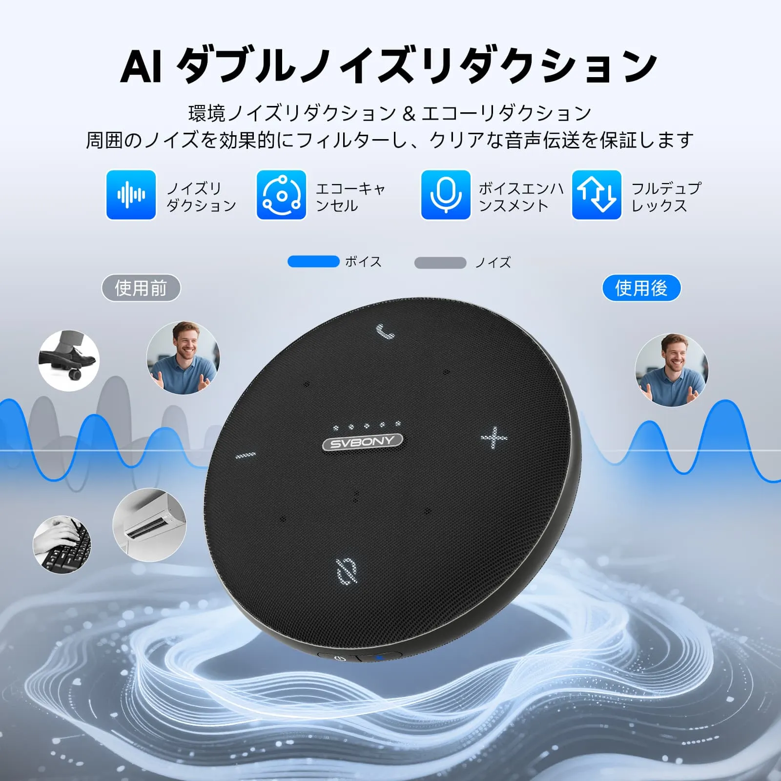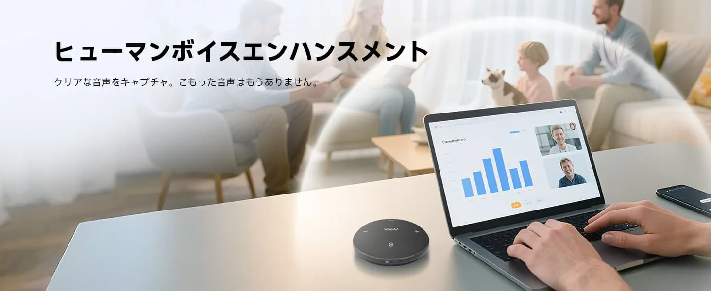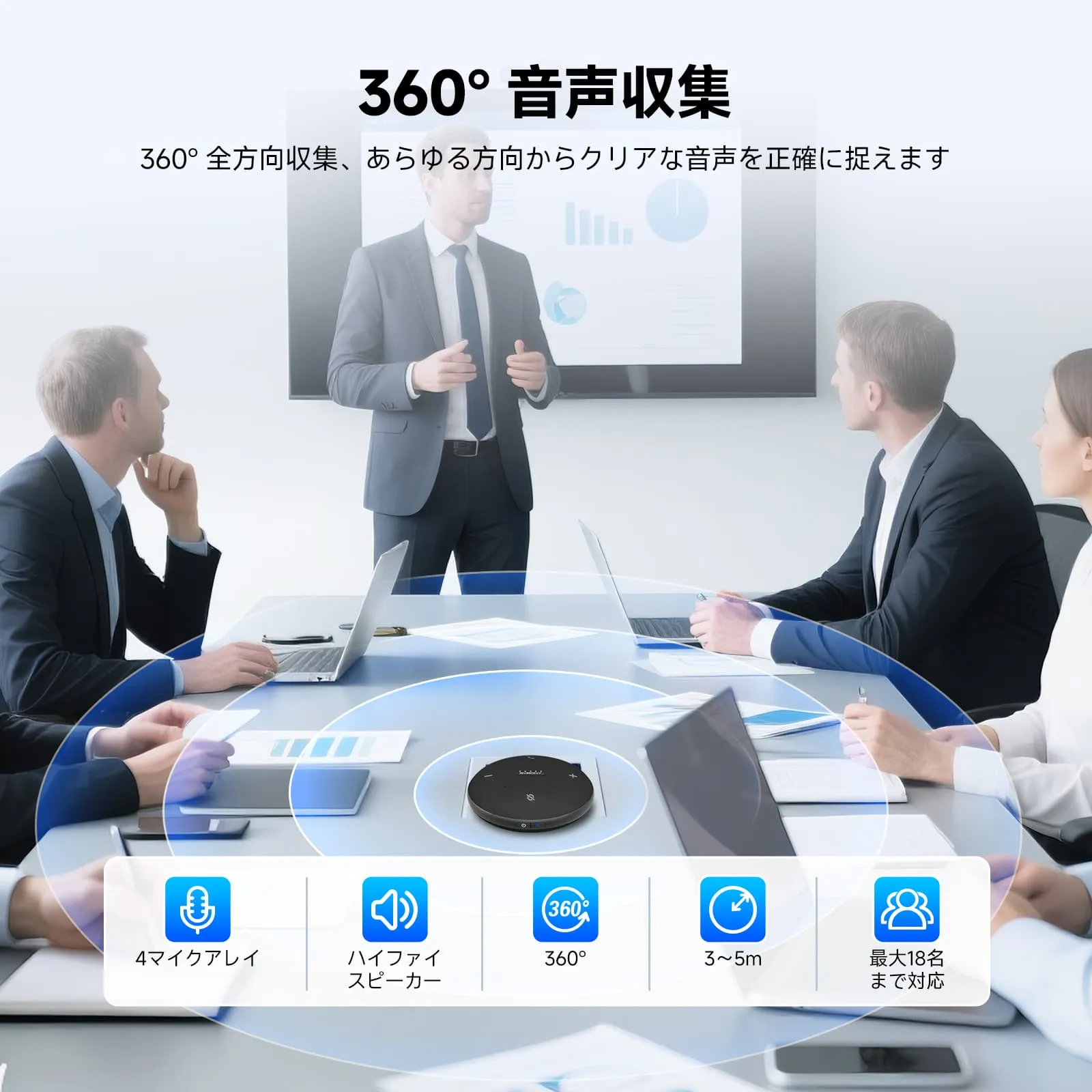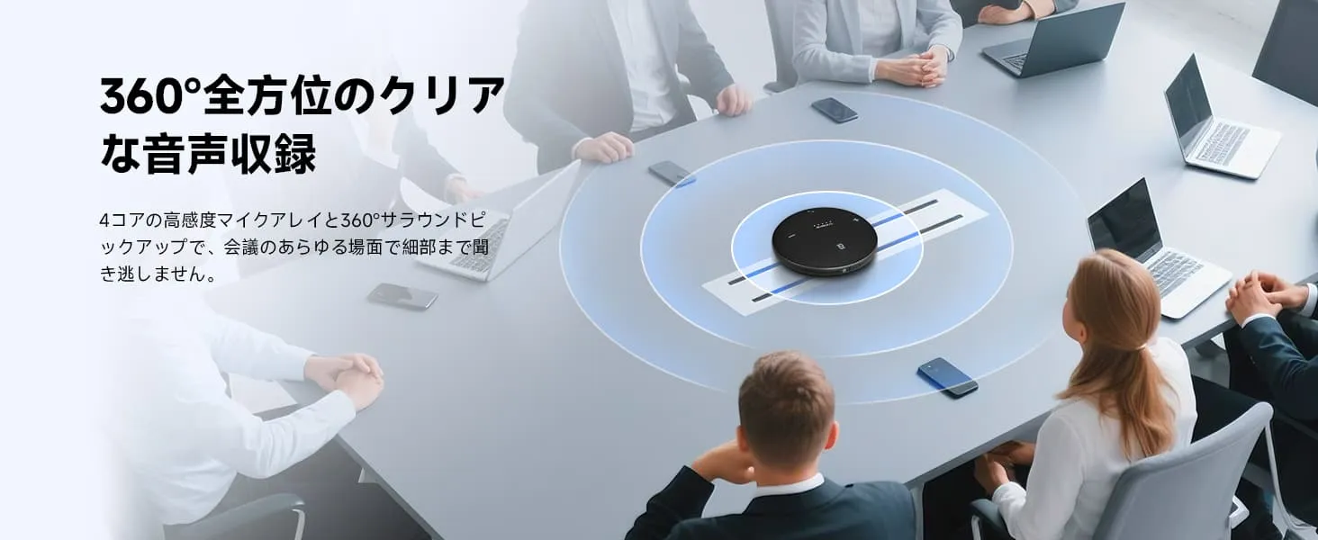 クリアな音声増幅:360°マイクは高度な音声増幅技術を搭載し、すべての言葉を明瞭に聞き取れるようにします。音声の明瞭度とダイナミックなサウンドが向上し、会話がよりプロフェッショナルで魅力的になります。