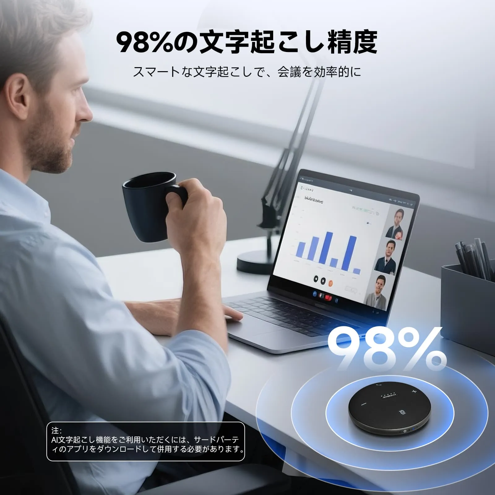 AI文字起こし: 98%の精度。サードパーティ製ソフトウェアを搭載する必要があります。重要な情報を逃さずに、会議のフォローアップをスムーズに行うために、あらゆる重要な詳細をキャプチャします。