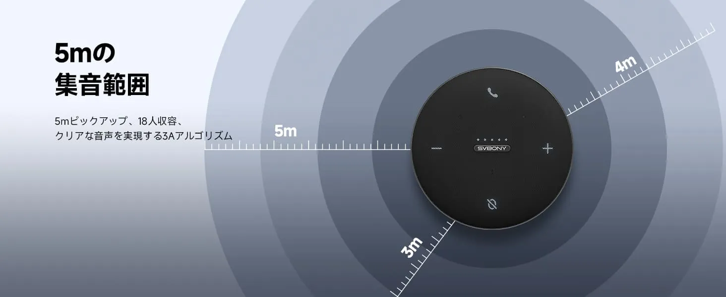 広範囲の集音が可能です。高感度マイクユニットを採用し、集音範囲は最大約5mで、多人数での会議やパソコンから離れた場所での通話などに便利です。