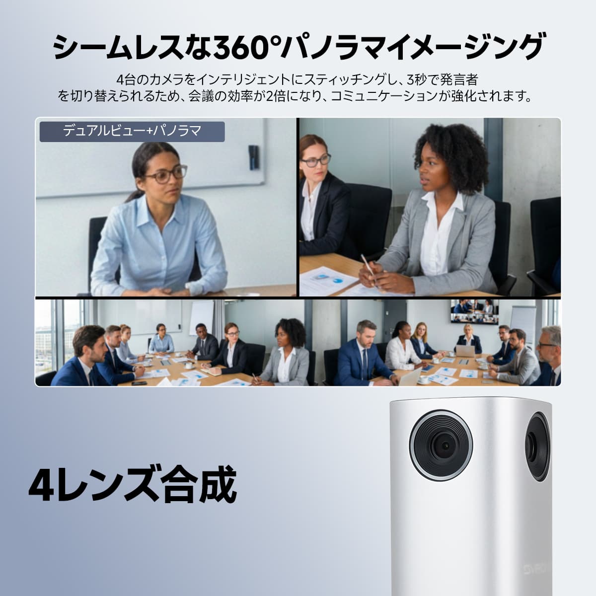 4レンズによるパノラマスティッチング技術で死角なく全体を撮影。AIスピーカートラッキングが発言者を自動追尾し、最適なフレーミングで映し出します。