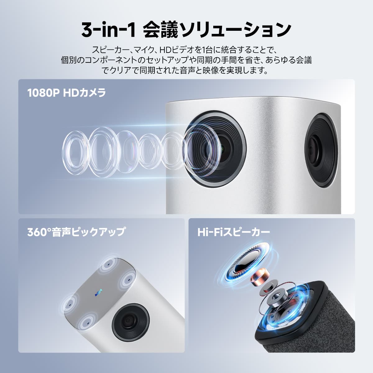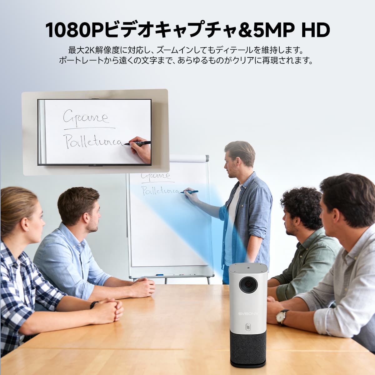 スピーカー・マイク・5MP HDカメラを一体化し、配線の煩雑さを解消。2K/1080Pの高画質と音声映像の完全同期で、クリアな会議を実現します。
