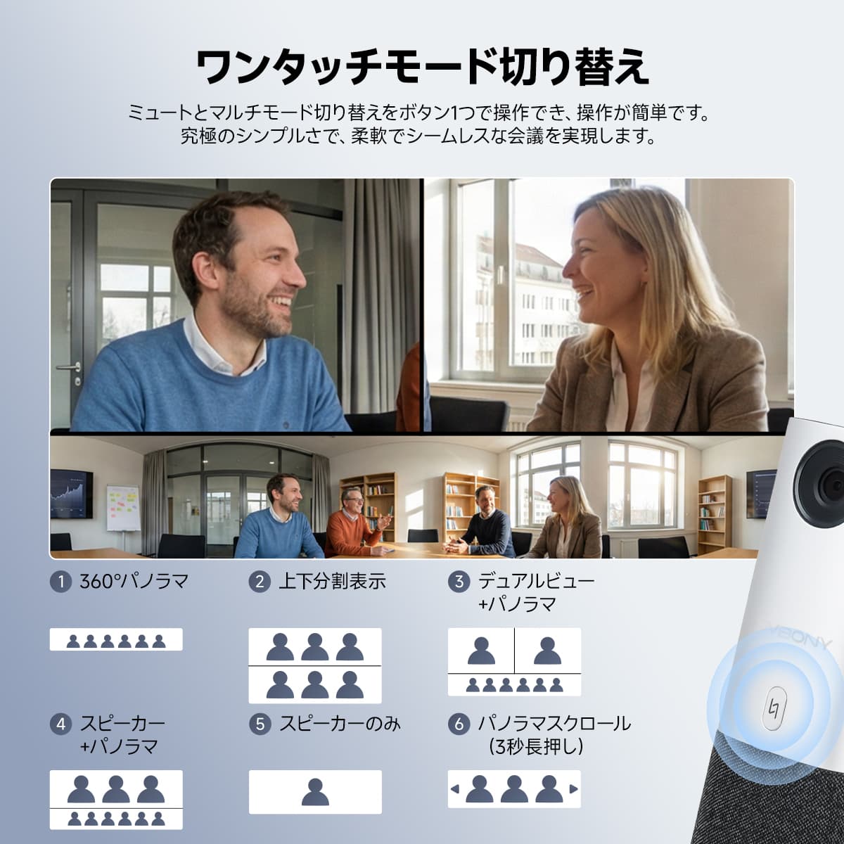 ワンタッチでミュート/ビューモード切替(パノラマ・クローズアップ等)。専用アプリからも遠隔操作可能で、自動顔認識や画像最適化もスマートに行えます。