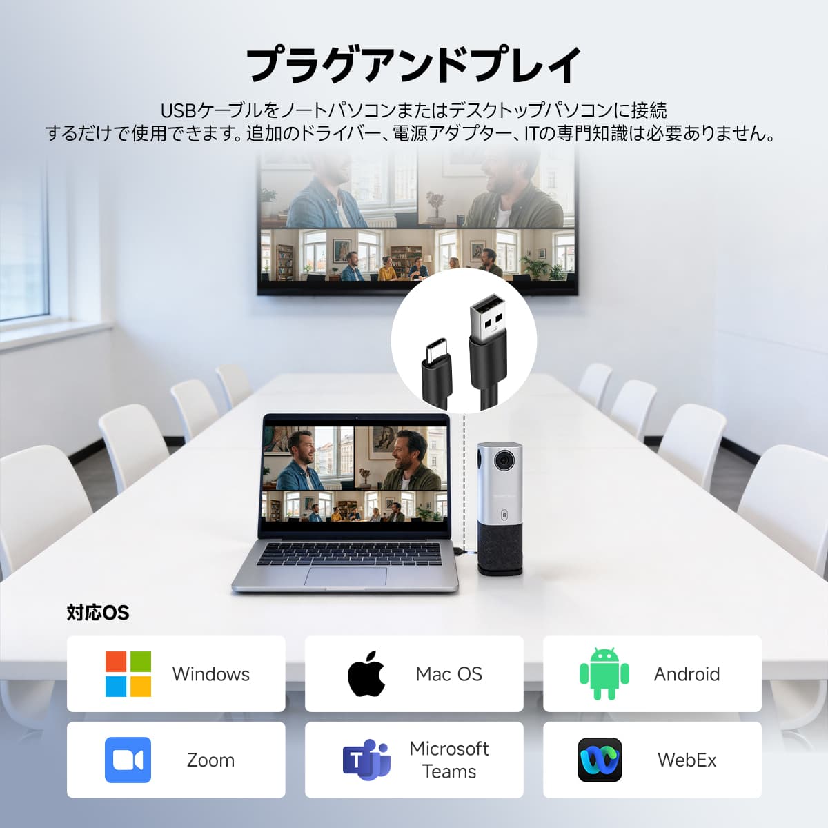 USBプラグアンドプレイ対応で設定不要。Windows/Mac/AndroidやZoom/Teams/WebEx等の主要プラットフォームでシームレスに使用可能です。