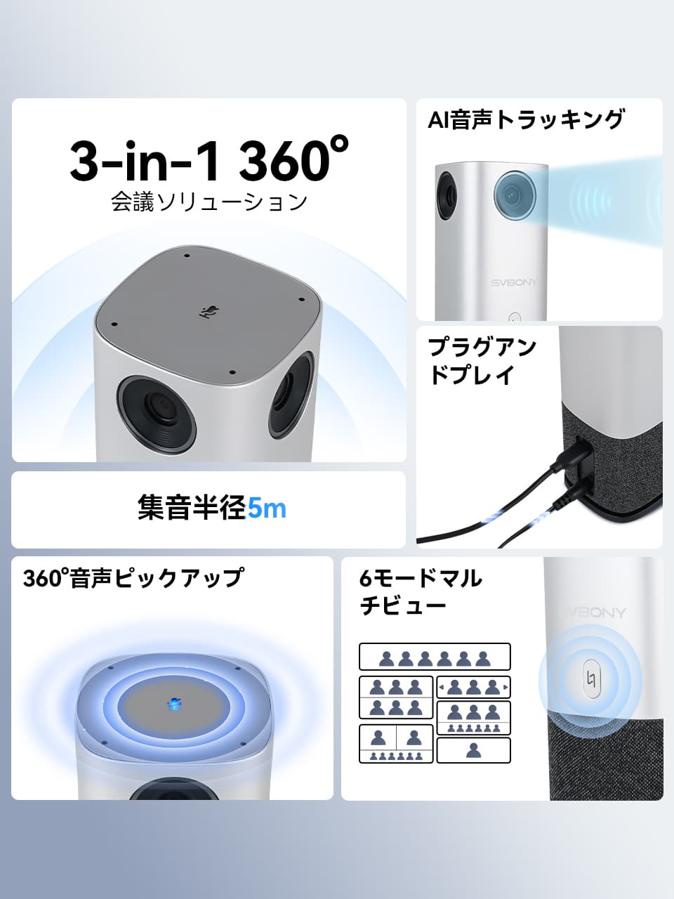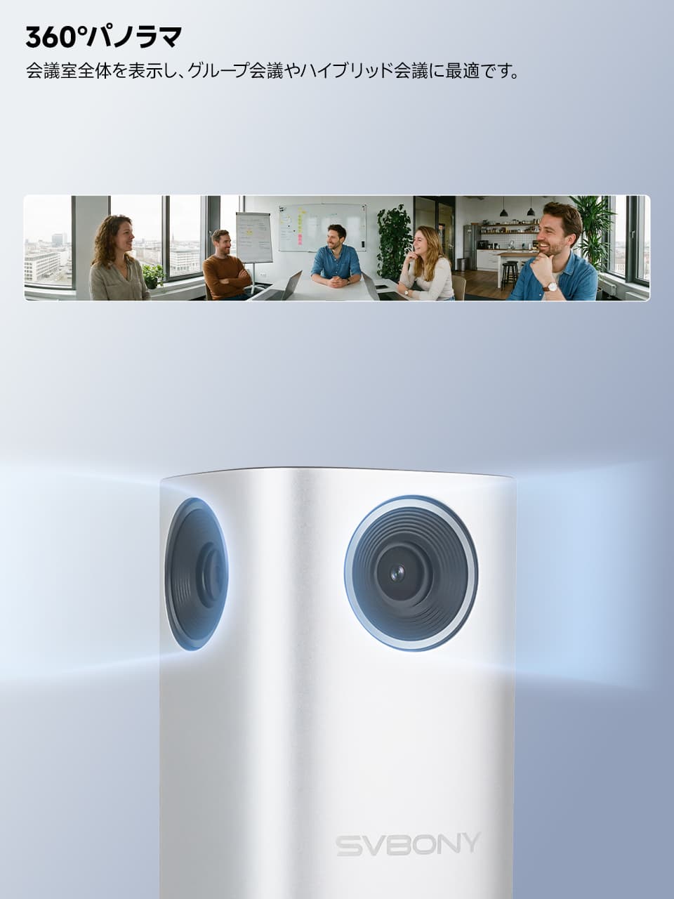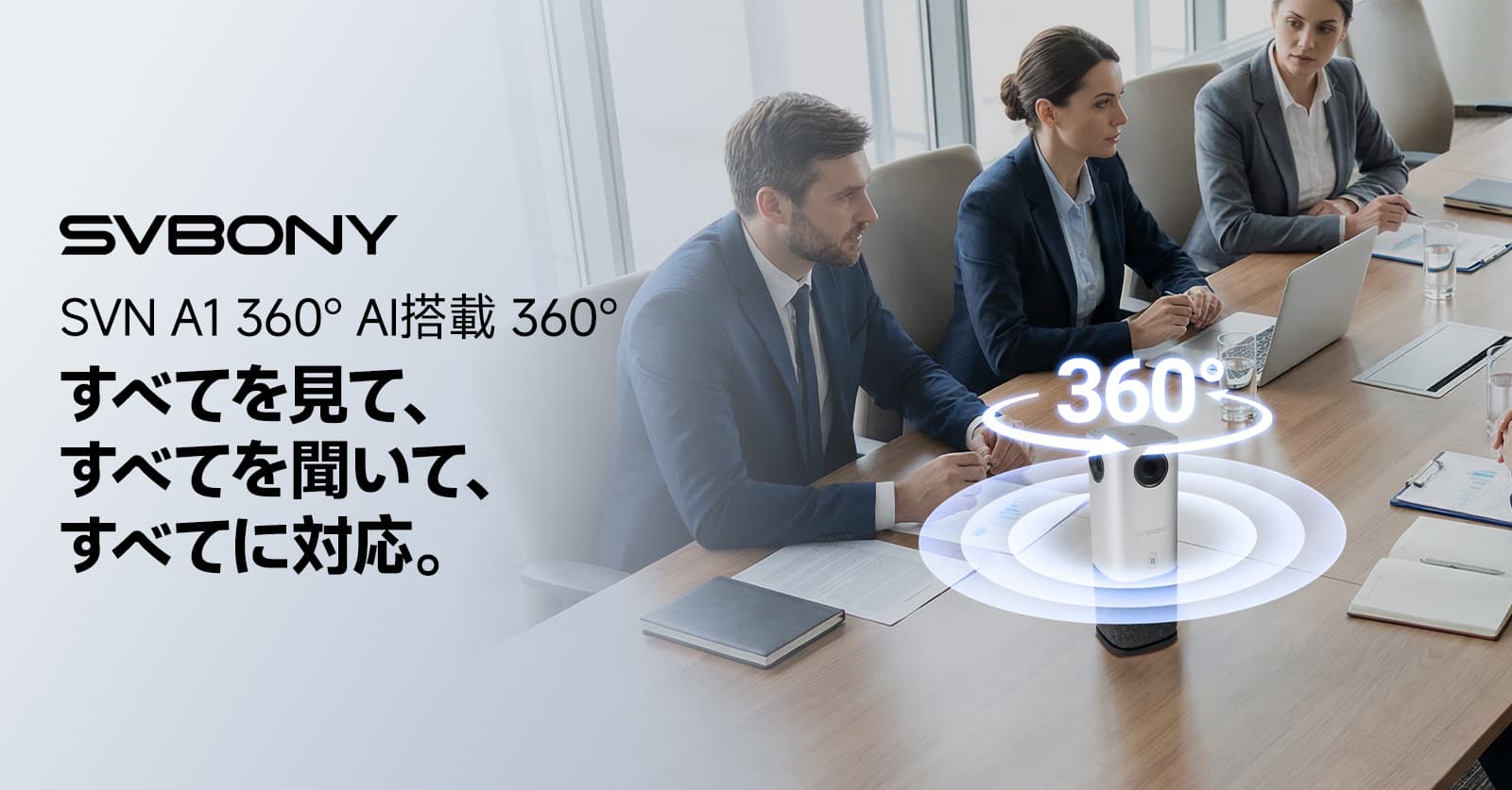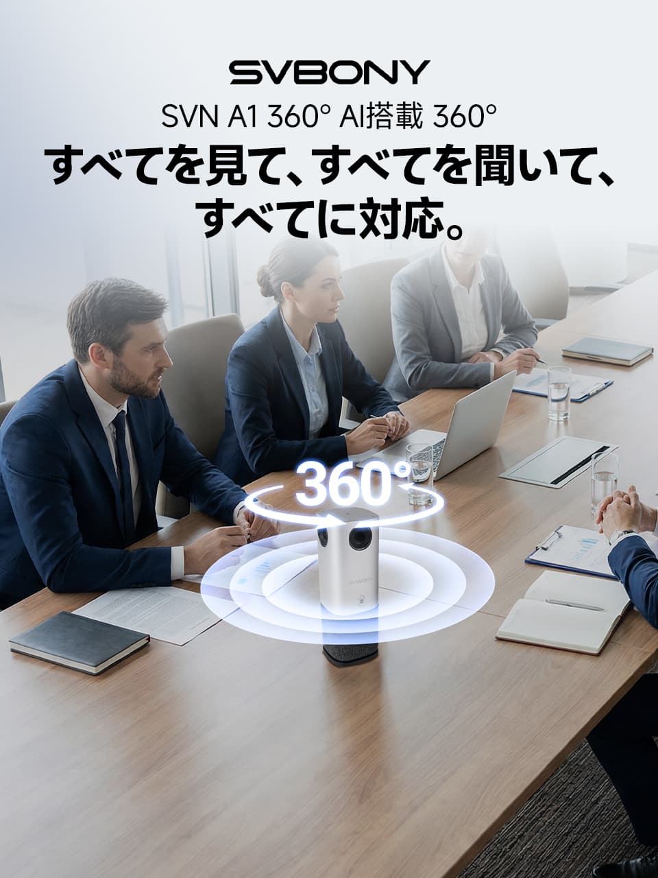 Write a reviewSVN A1 360°オールインワン会議システムは、高画質ビデオ、360°マルチビュー、AI話者トラッキング、高品質オーディオをコンパクトな1台に統合。5MPカメラ(最大2K)、4レンズによるスティッチング、ノイズ低減機能付き4+1マイクアレイ、ステレオサラウンドスピーカーを搭載。ワンタッチ操作、アプリ管理、USBプラグアンドプレイに対応し、クリアな映像と臨場感あふれるサウンドで効率的な会議を実現します。