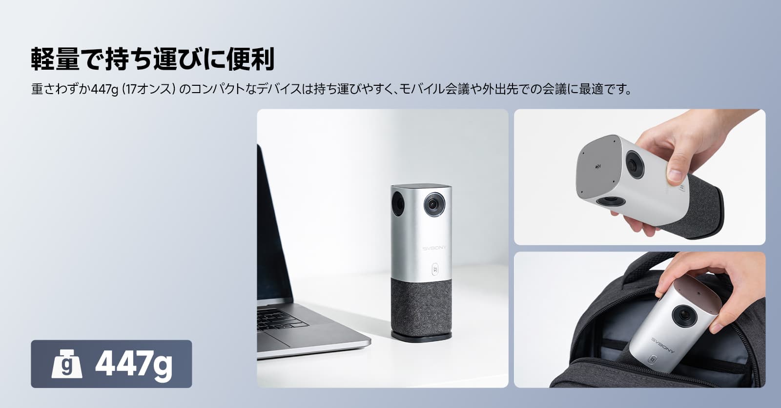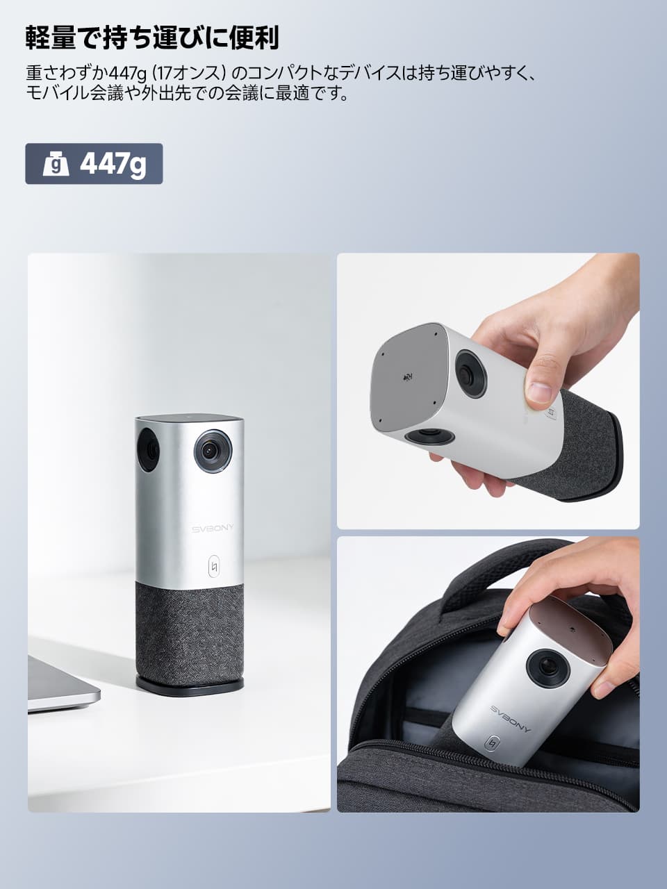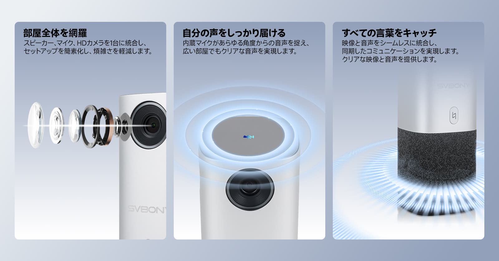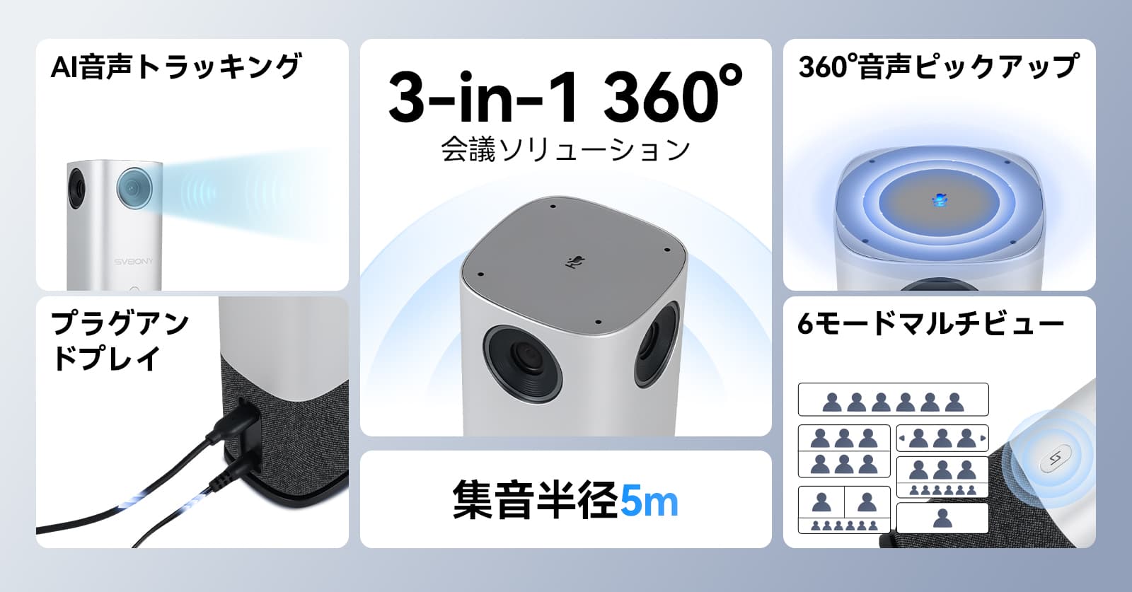Write a reviewSVN A1 360°オールインワン会議システムは、高画質ビデオ、360°マルチビュー、AI話者トラッキング、高品質オーディオをコンパクトな1台に統合。5MPカメラ(最大2K)、4レンズによるスティッチング、ノイズ低減機能付き4+1マイクアレイ、ステレオサラウンドスピーカーを搭載。ワンタッチ操作、アプリ管理、USBプラグアンドプレイに対応し、クリアな映像と臨場感あふれるサウンドで効率的な会議を実現します。