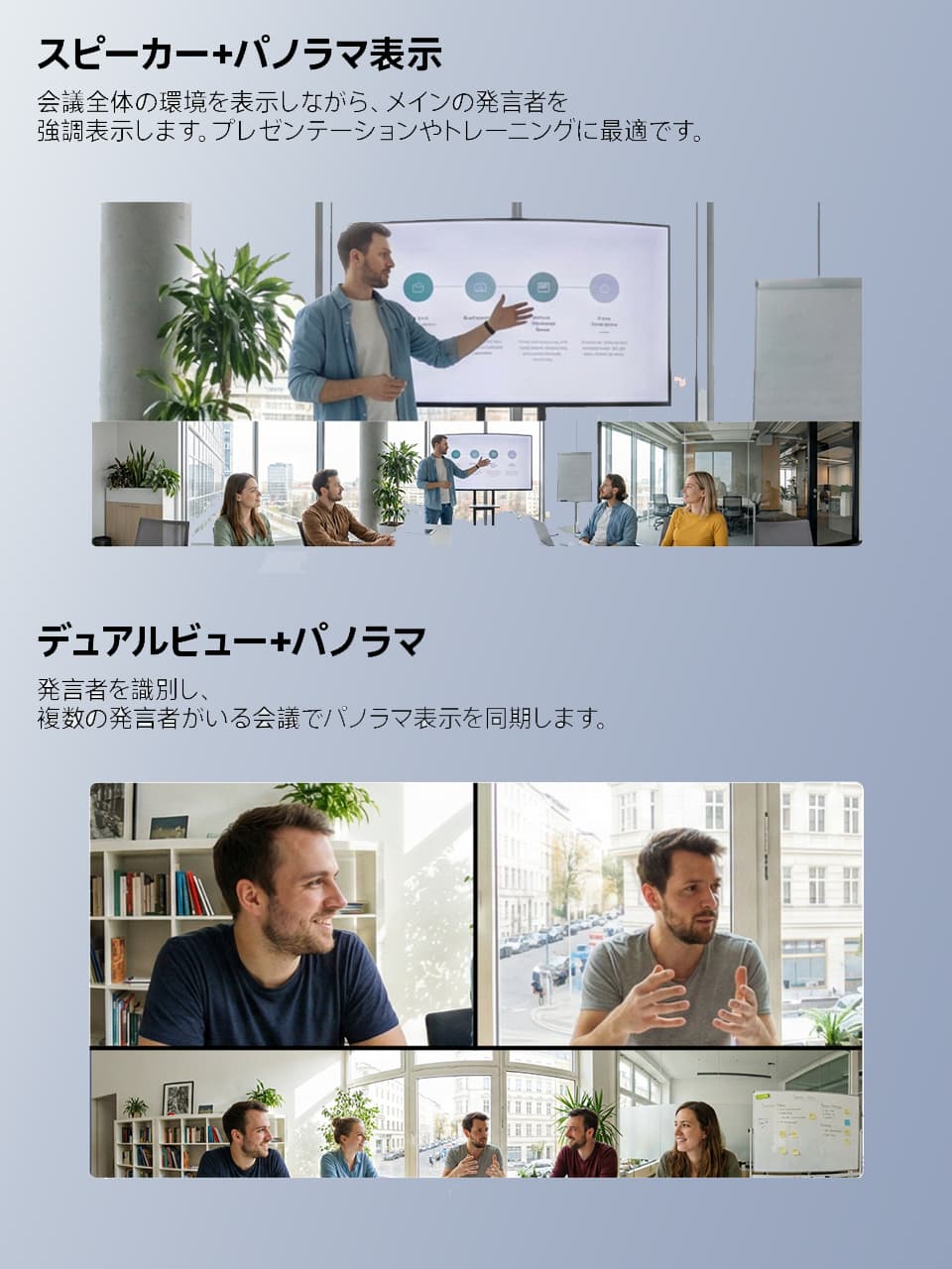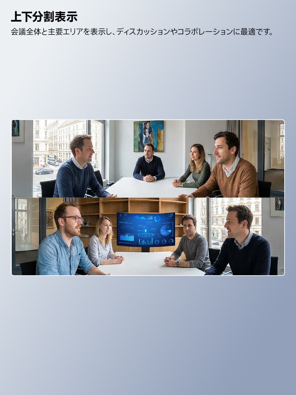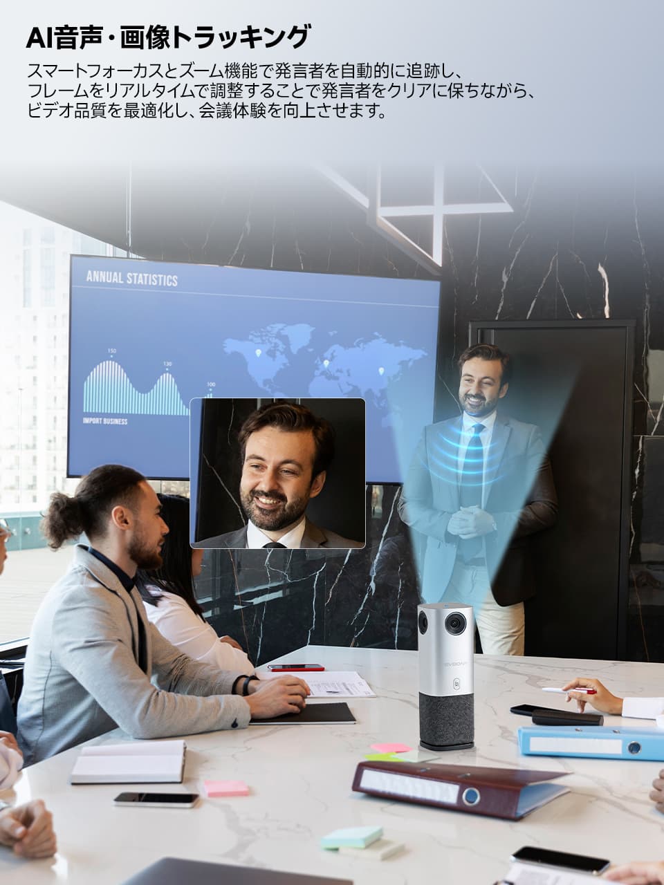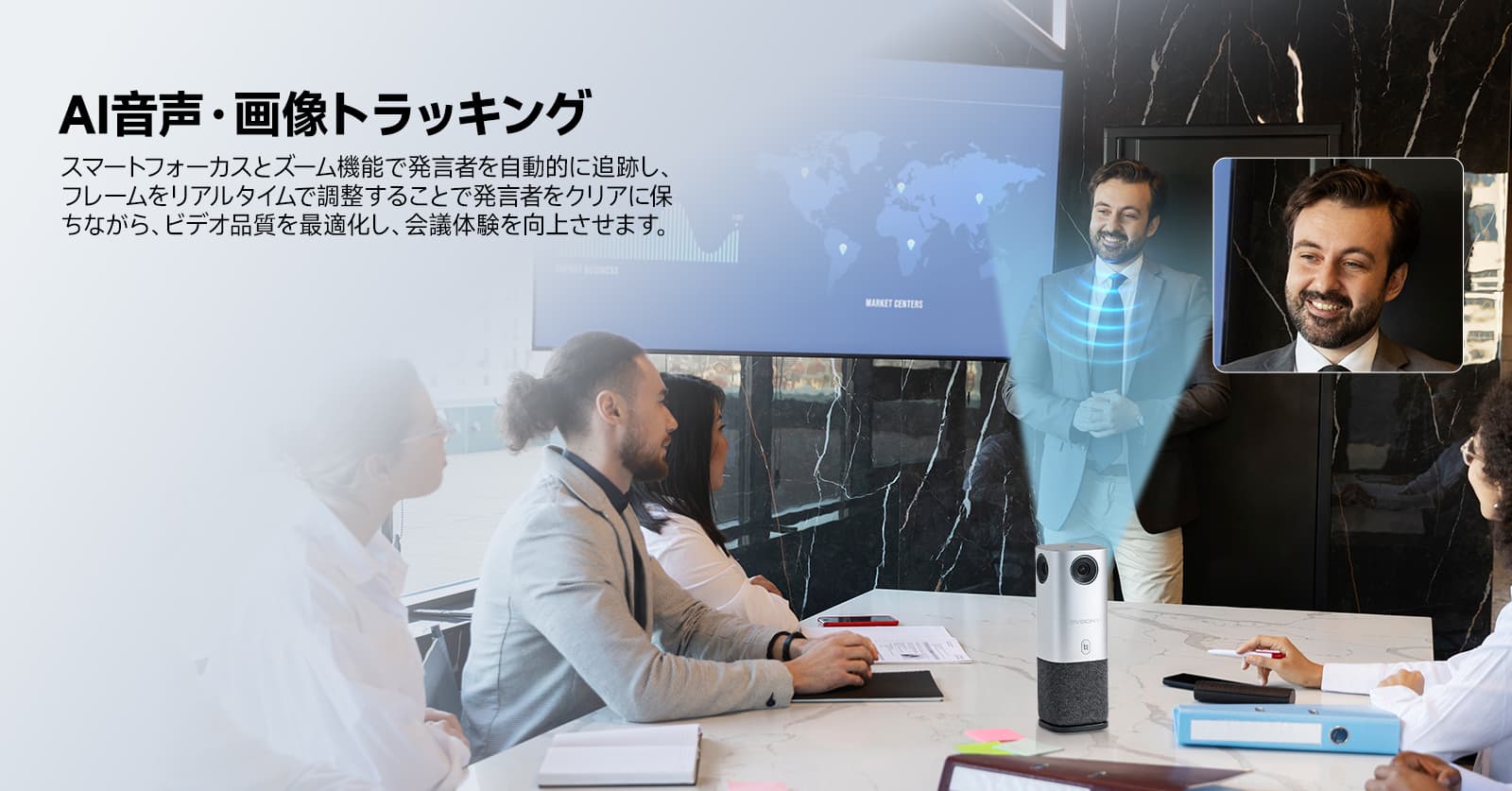 4レンズによるパノラマスティッチング技術で死角なく全体を撮影。AIスピーカートラッキングが発言者を自動追尾し、最適なフレーミングで映し出します。