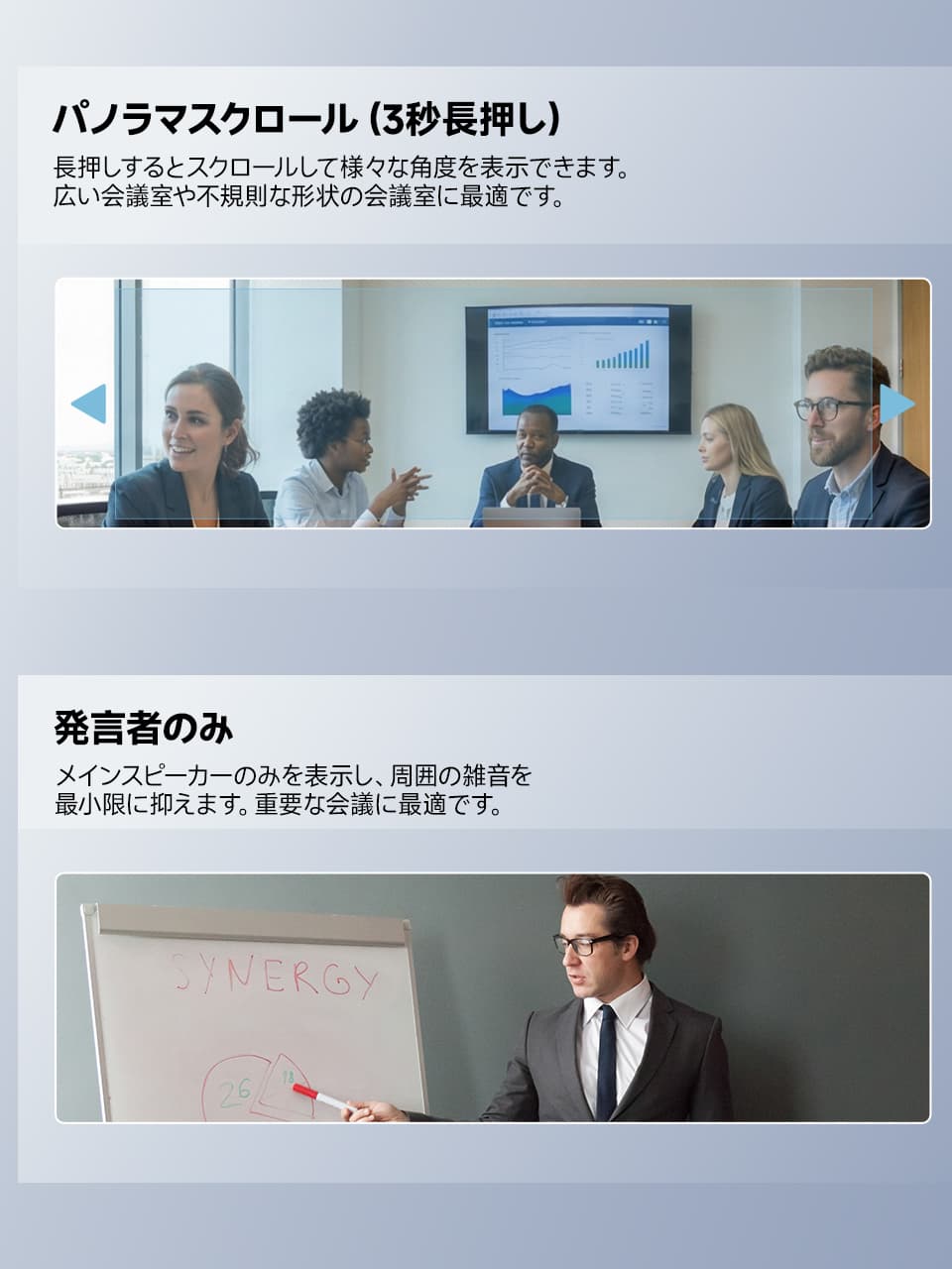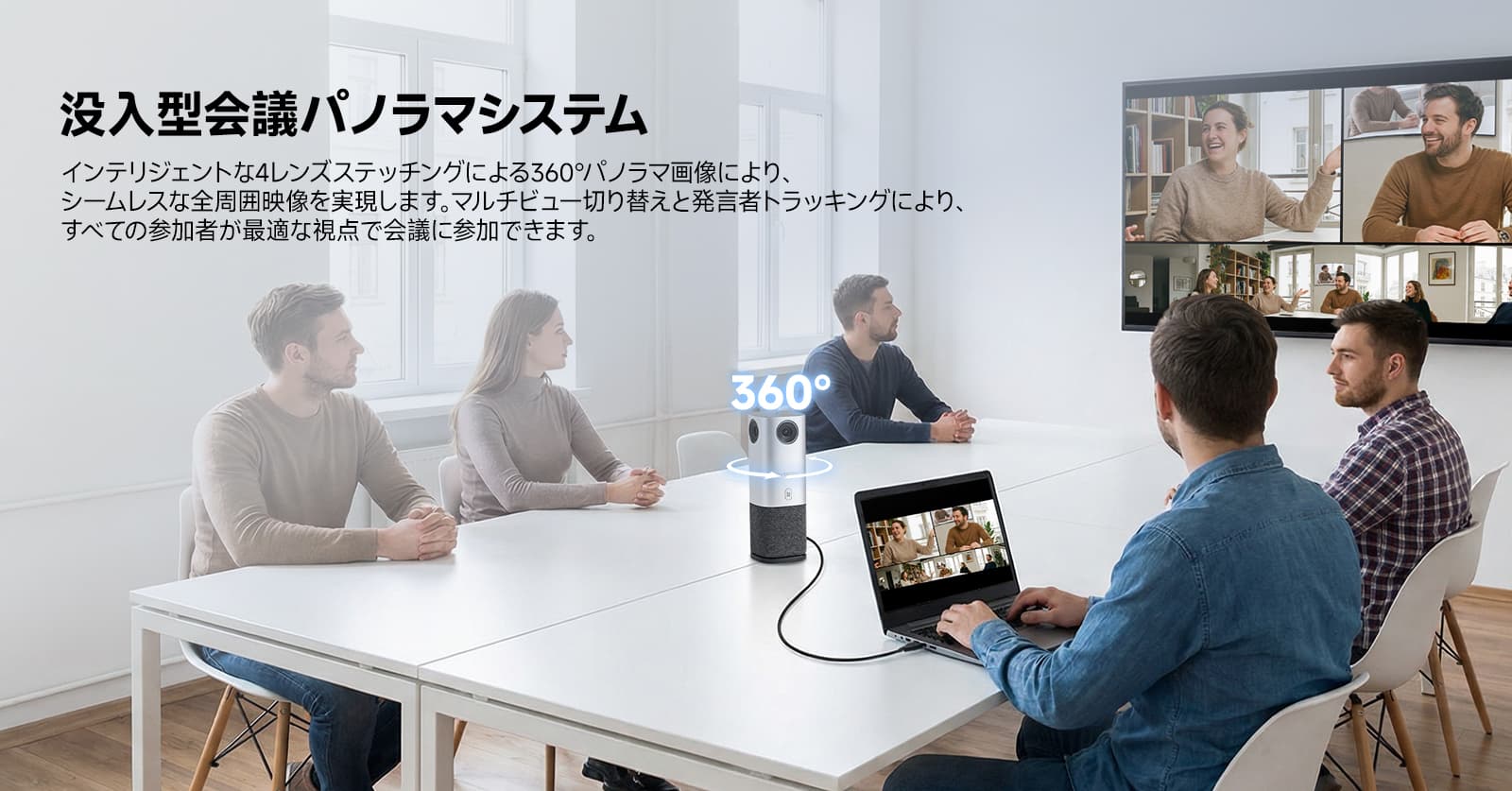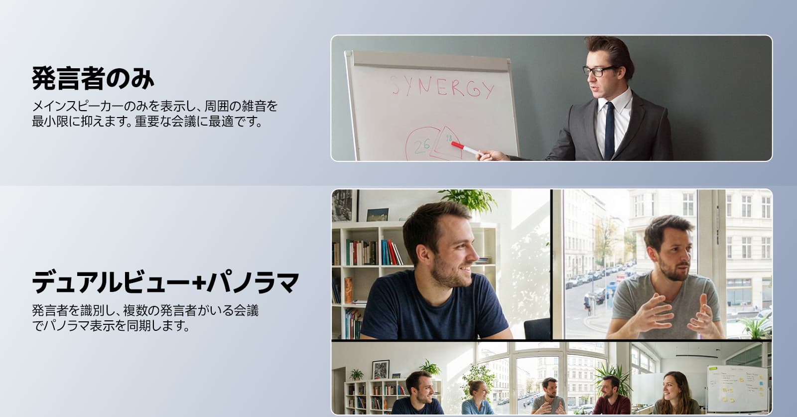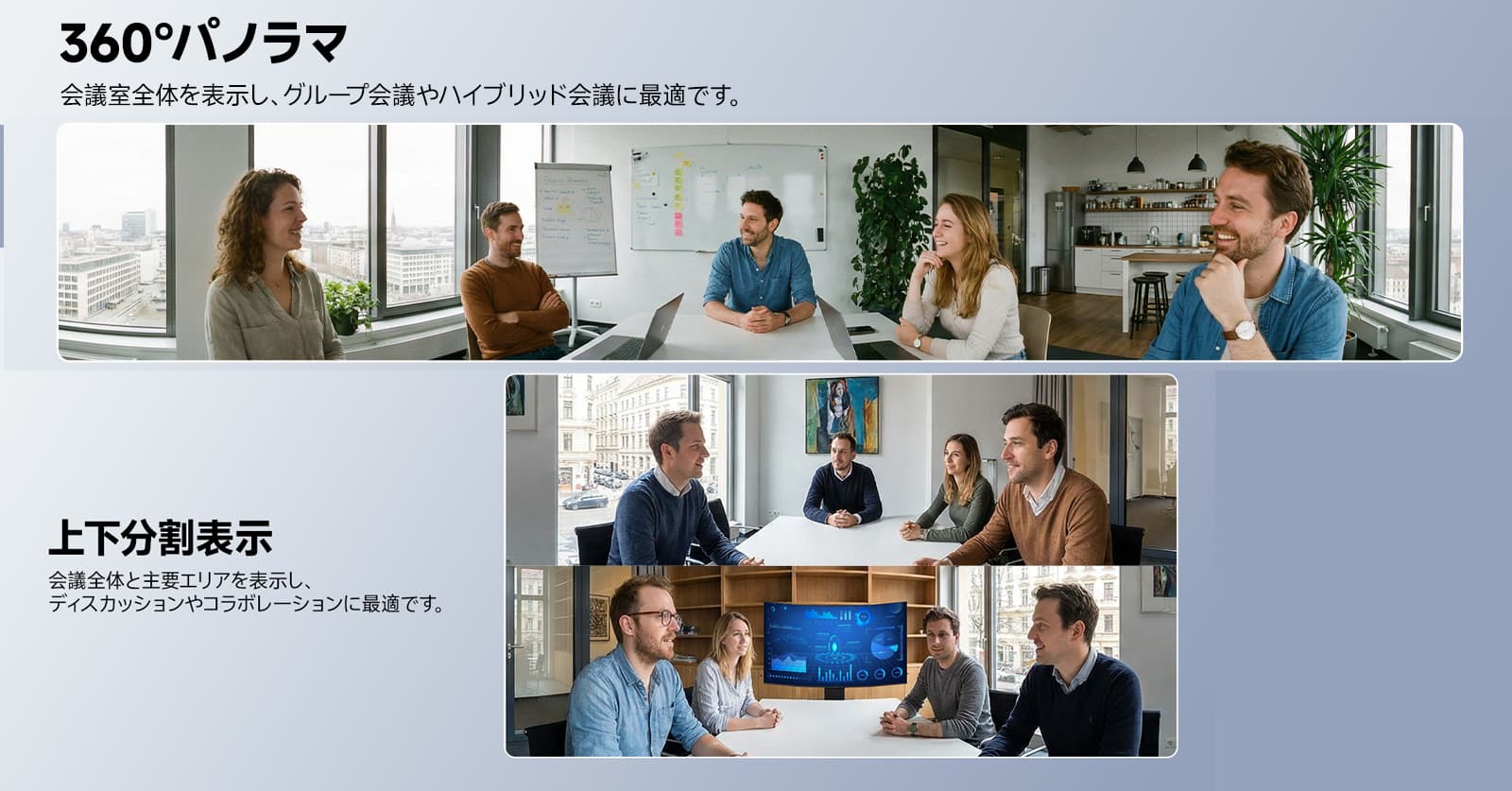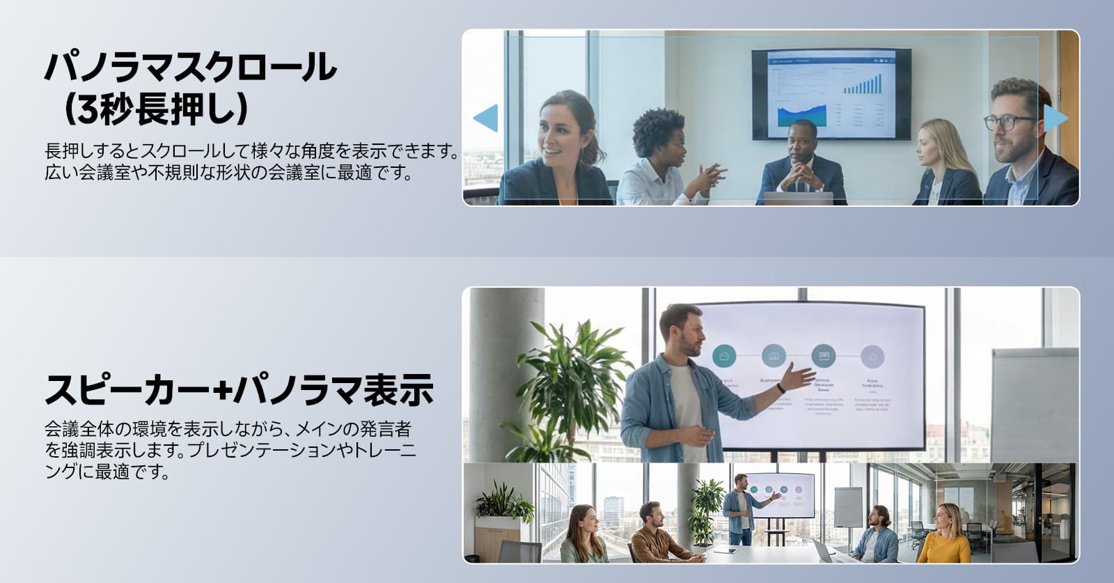 4レンズによるパノラマスティッチング技術で死角なく全体を撮影。AIスピーカートラッキングが発言者を自動追尾し、最適なフレーミングで映し出します。